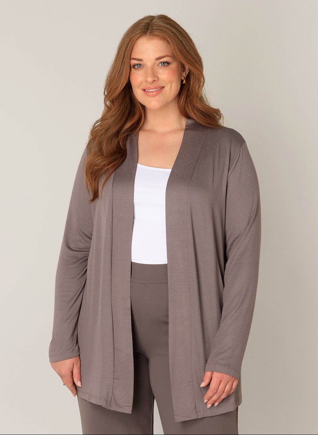 Vest Ayla van Base Level Curvy is een medium lang vest gemaakt in een zachte viscosemix. Het vest heeft lange mouwen en valt open. Dit item is 80cm lang.