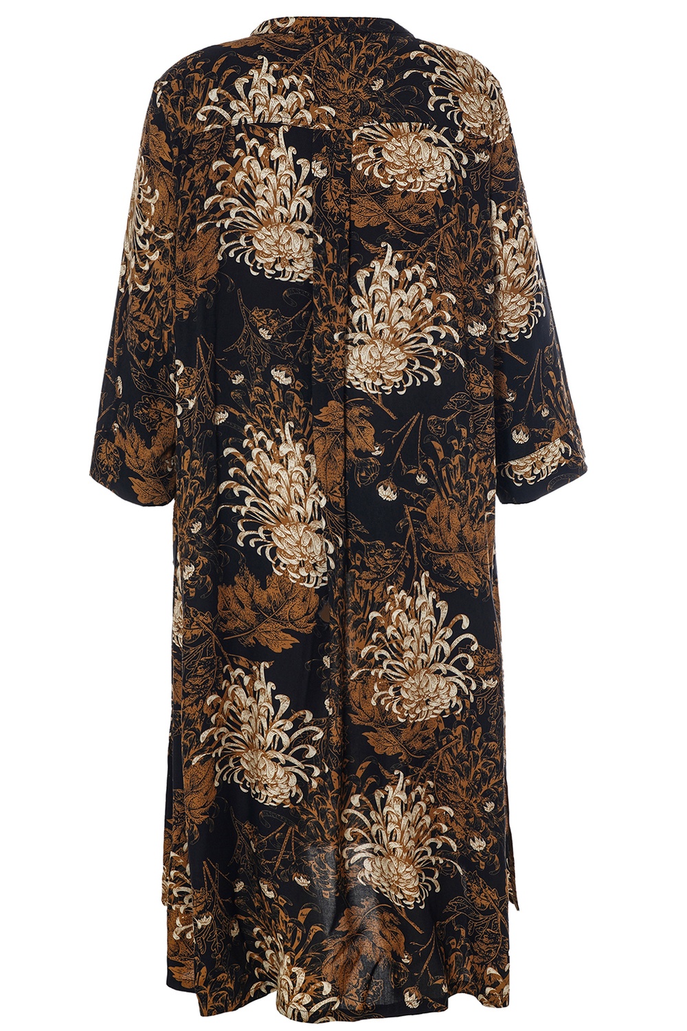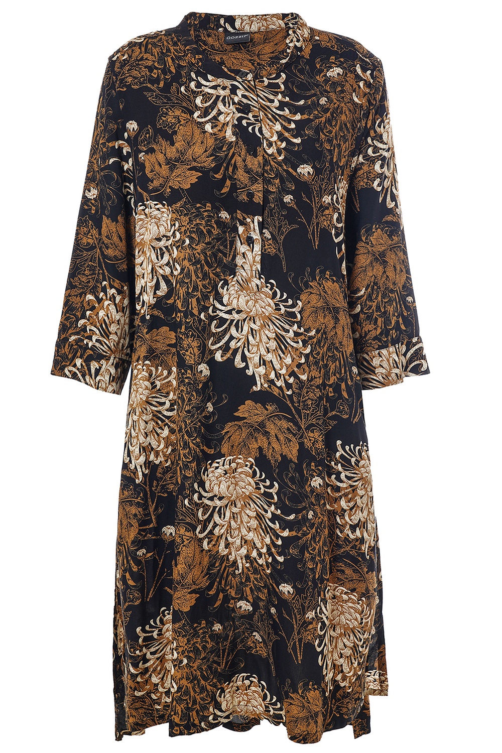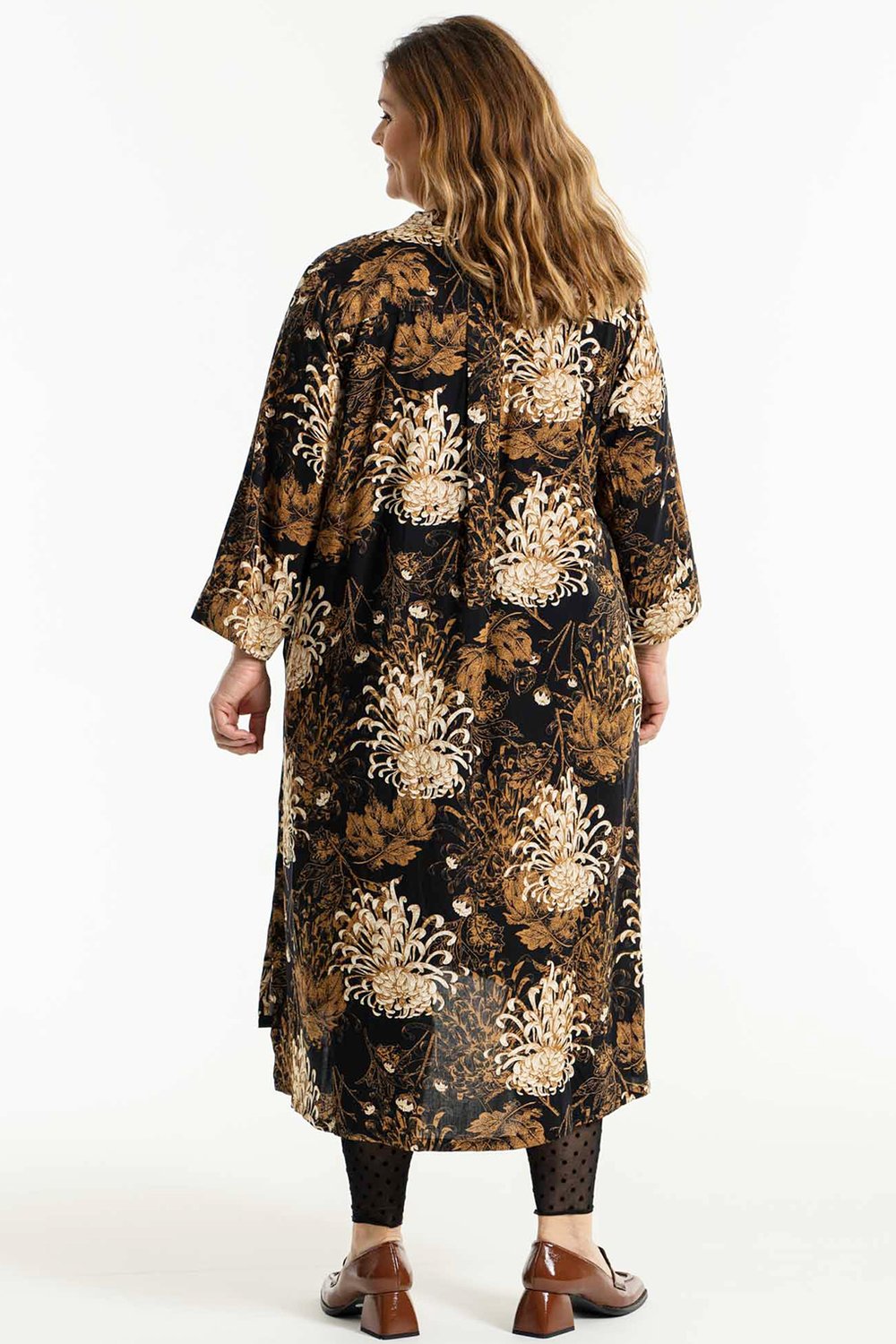 De jurk heeft een comfortabele ronde hals met een langer knooppad en elegante lange mouwen die rechtvallen, zonder manchet.