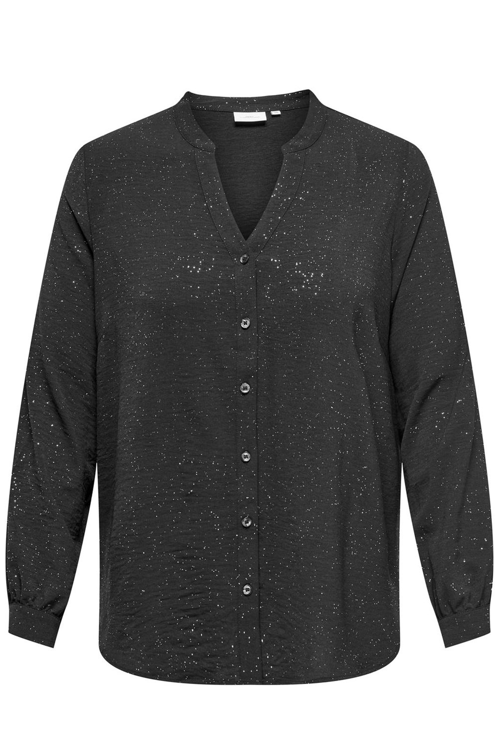 ONLY Carmakoma ECO blouse JOSEE  heeft een V halss en een rondlopend boordje. Hij is gemaakt in een mooie stof met een zilverkleurige glitter. Hij heeft afgeronde panden en sluit met glans knoopjes. De lange mouwen hebben een normale manchet. Er is een bijpassende broek 15334526