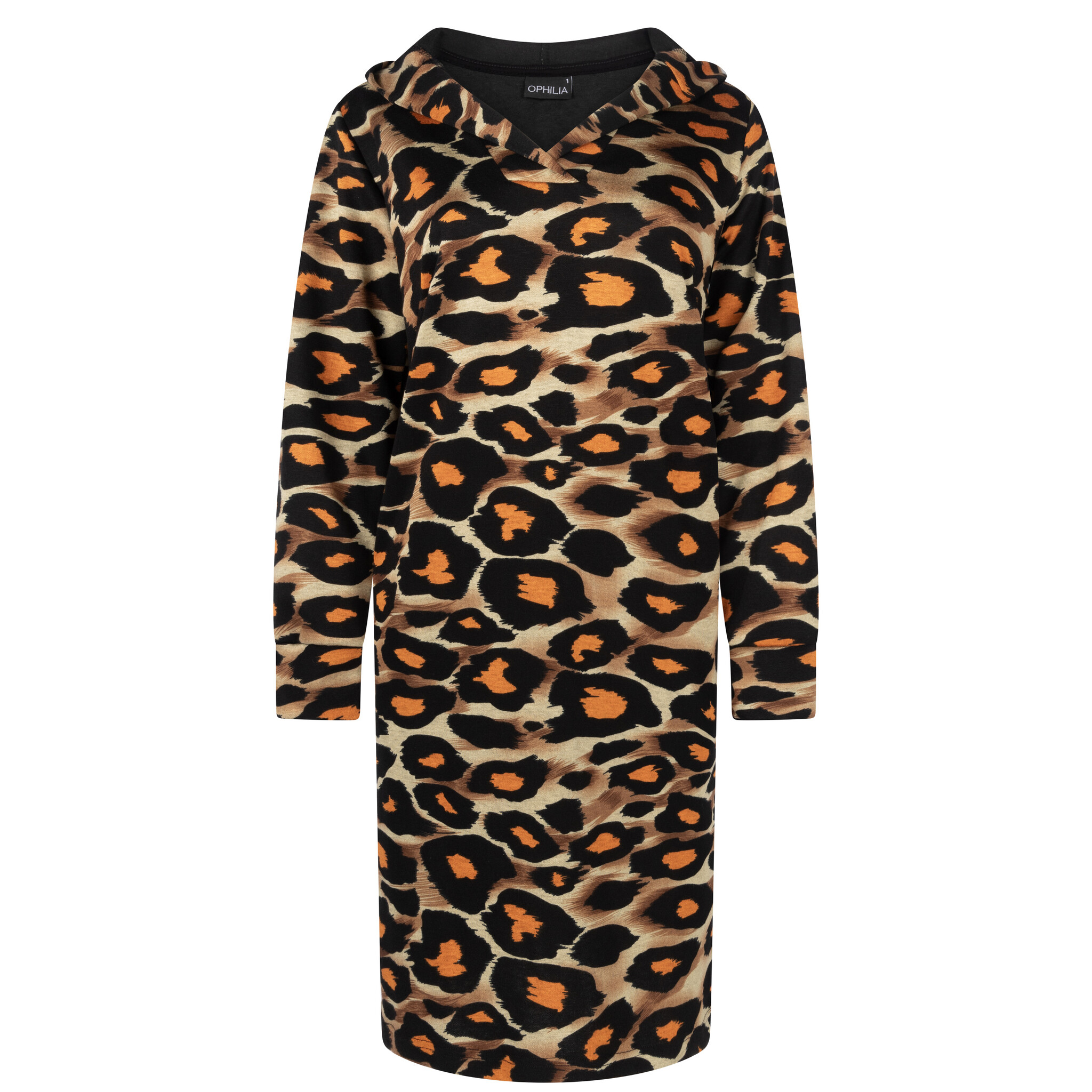 Ophilia jurk Ivana print is een super vlot model door de capuchon en V hals met overslag. Hij heeft lange mouwen met een brede boord en in de zijnaad zitten zakken. De lengte valt over de knie, dus leuk te combineren met de leatherlook legging Suna 22S.