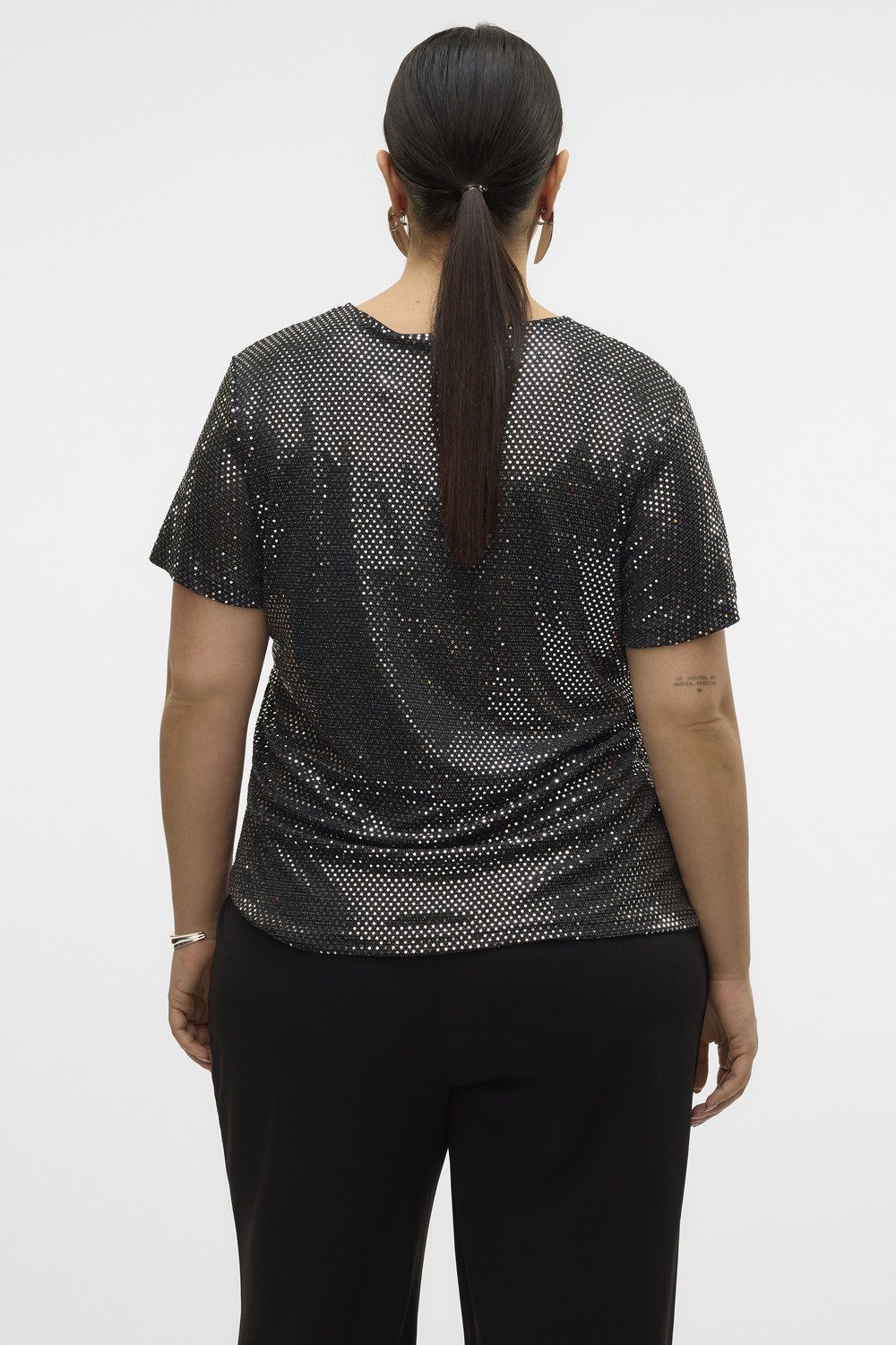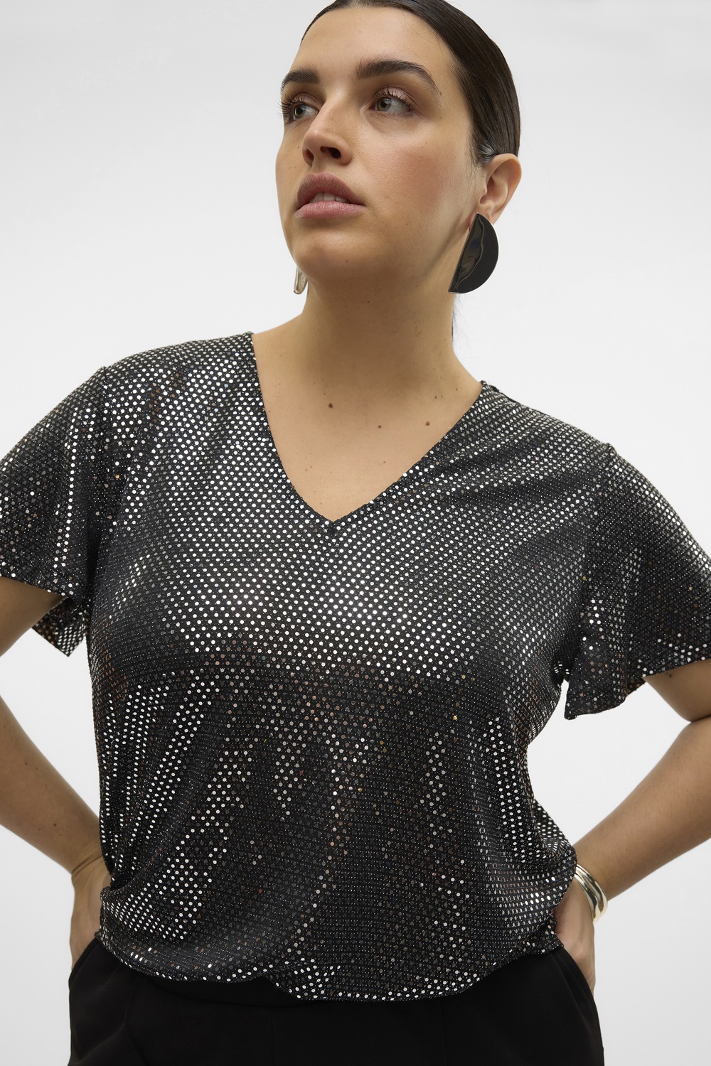 Het VERO MODA Curve Evaline shirt is een sprankelende toevoeging aan je garderobe, gemaakt van een super glitterstofje met een prachtige pailletten look. Het shirt heeft een V-hals en loopt licht uit voor een flatterend silhouet, terwijl de korte mouwen iets wijder vallen voor een speels effect.
