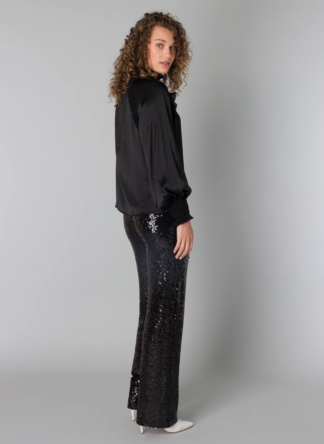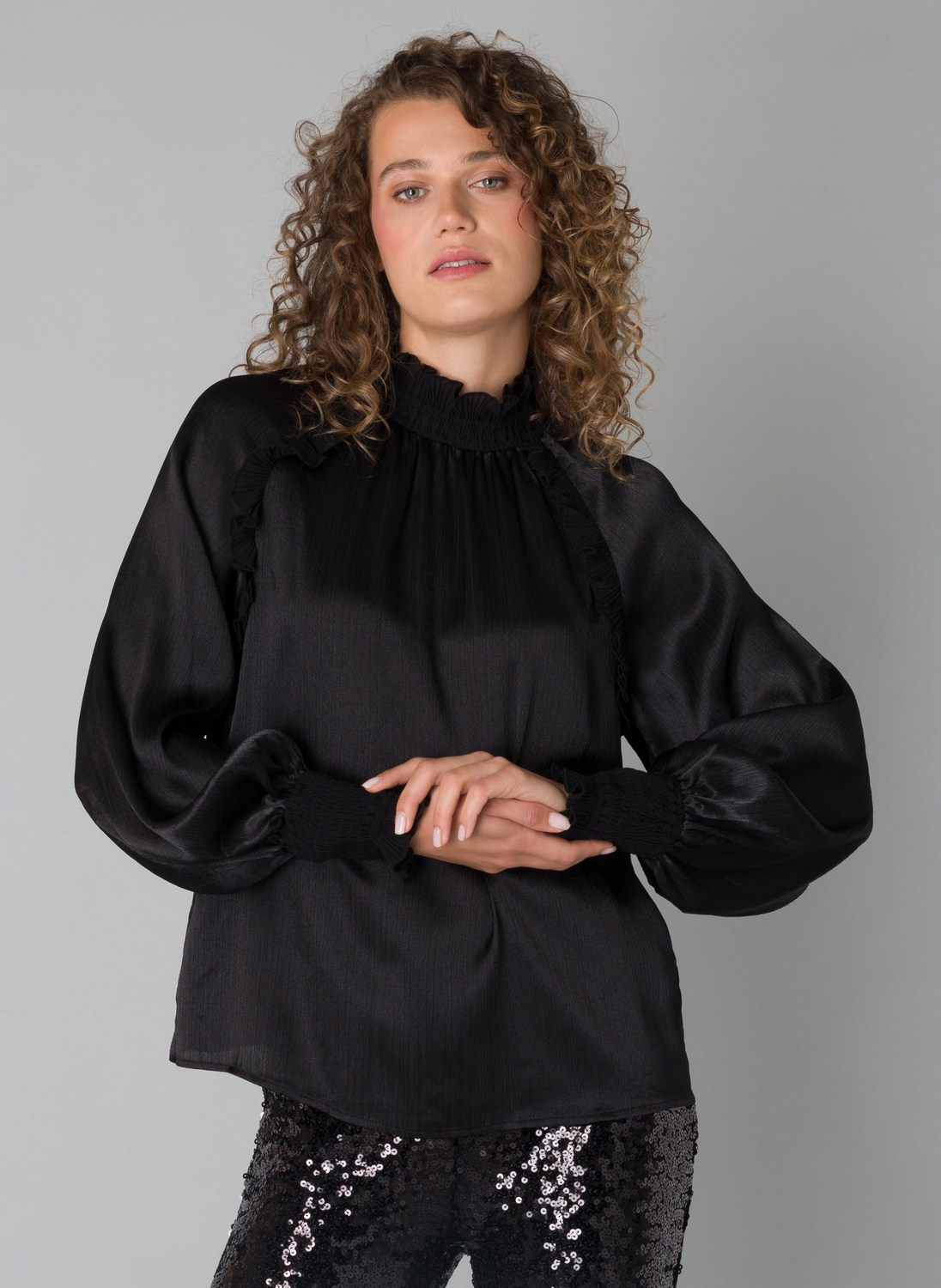 Maak een stijlvolle indruk met de Yest Palma blouse in diepzwart, met een lengte van 63 cm die perfect valt over de taille voor een flatterend silhouet. De blouse heeft een subtiel shiny finish, een ruffled hoge neklijn en manchetten voor een elegante touch, terwijl de wijde mouwen een speels en luchtig effect creëren.