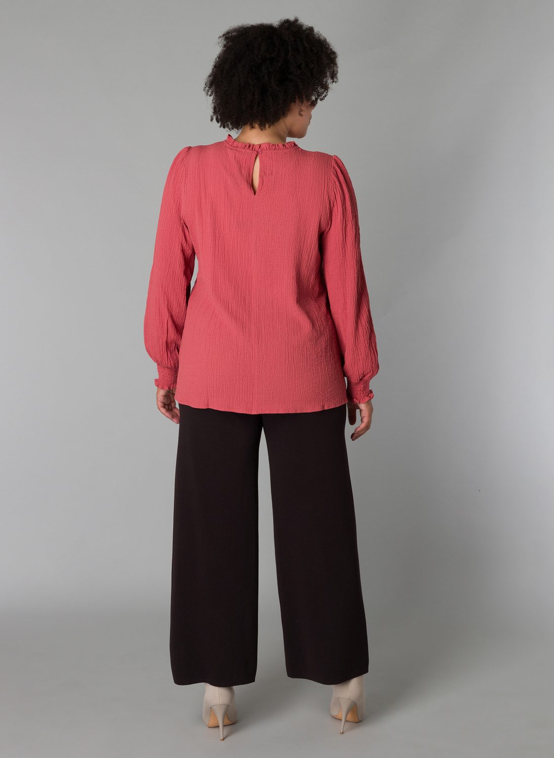 YESTA Sabine blouse, 72 cm lang, Brick Red. Deze elegante blouse top met lange mouwen heeft ruches langs de halslijn en gesmokte elastische manchetten voor een verfijnde look. De plooien bij de schouders voegen een extra vleugje stijl toe. Gemaakt van een hoogwaardige polyester-viscose mix voor een comfortabele en chique uitstraling. Ontdek de YESTA Sabine blouse en voeg een stijlvolle touch toe aan je garderobe!
