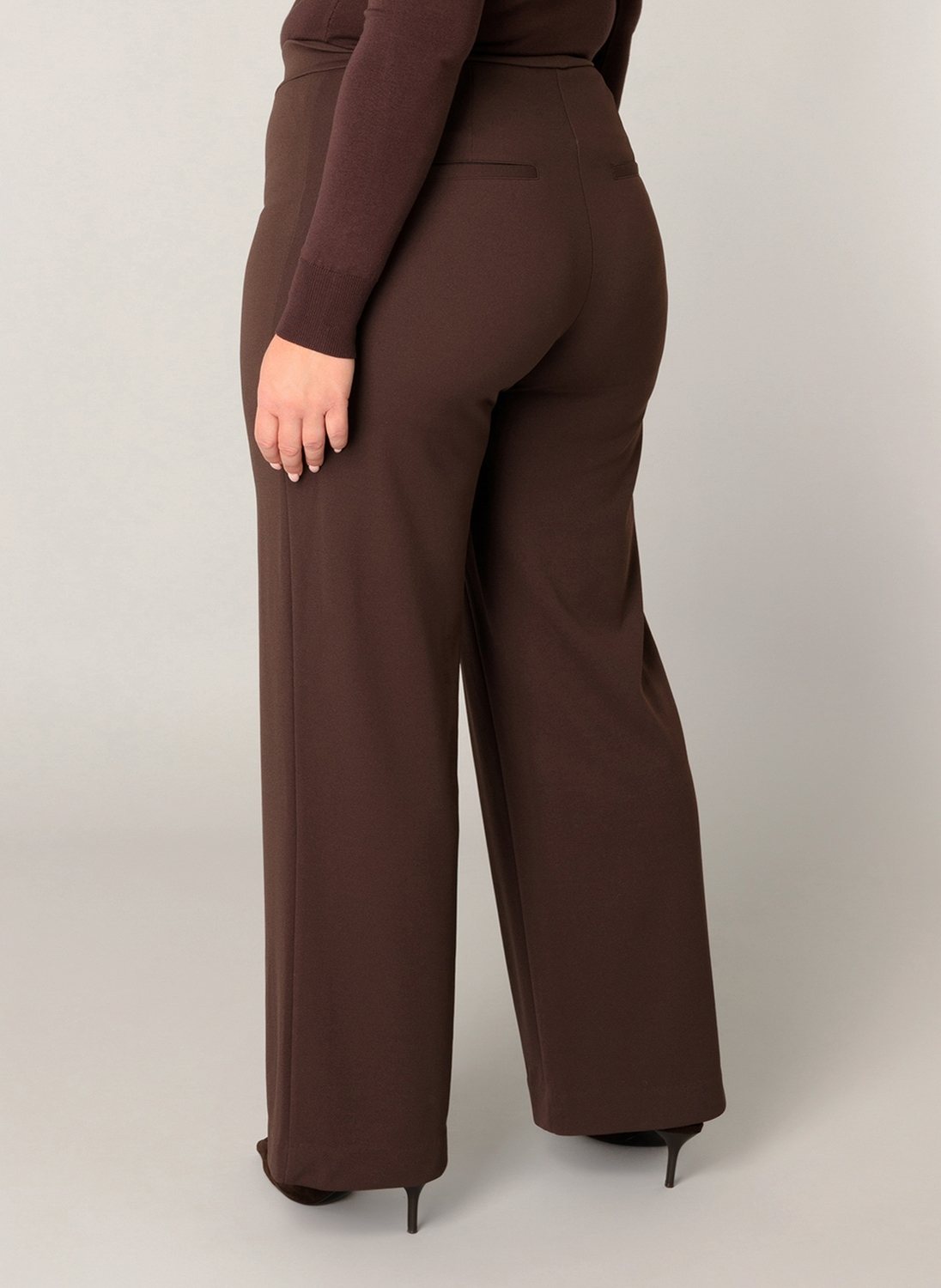 De Arah van Base Level Curvy is een wijde broek van recycled polyester met een elastische tailleband en dichte paspelzakken op het achterpand. Arah is verkrijgbaar in light beige, dark taupe, dark blue en black.