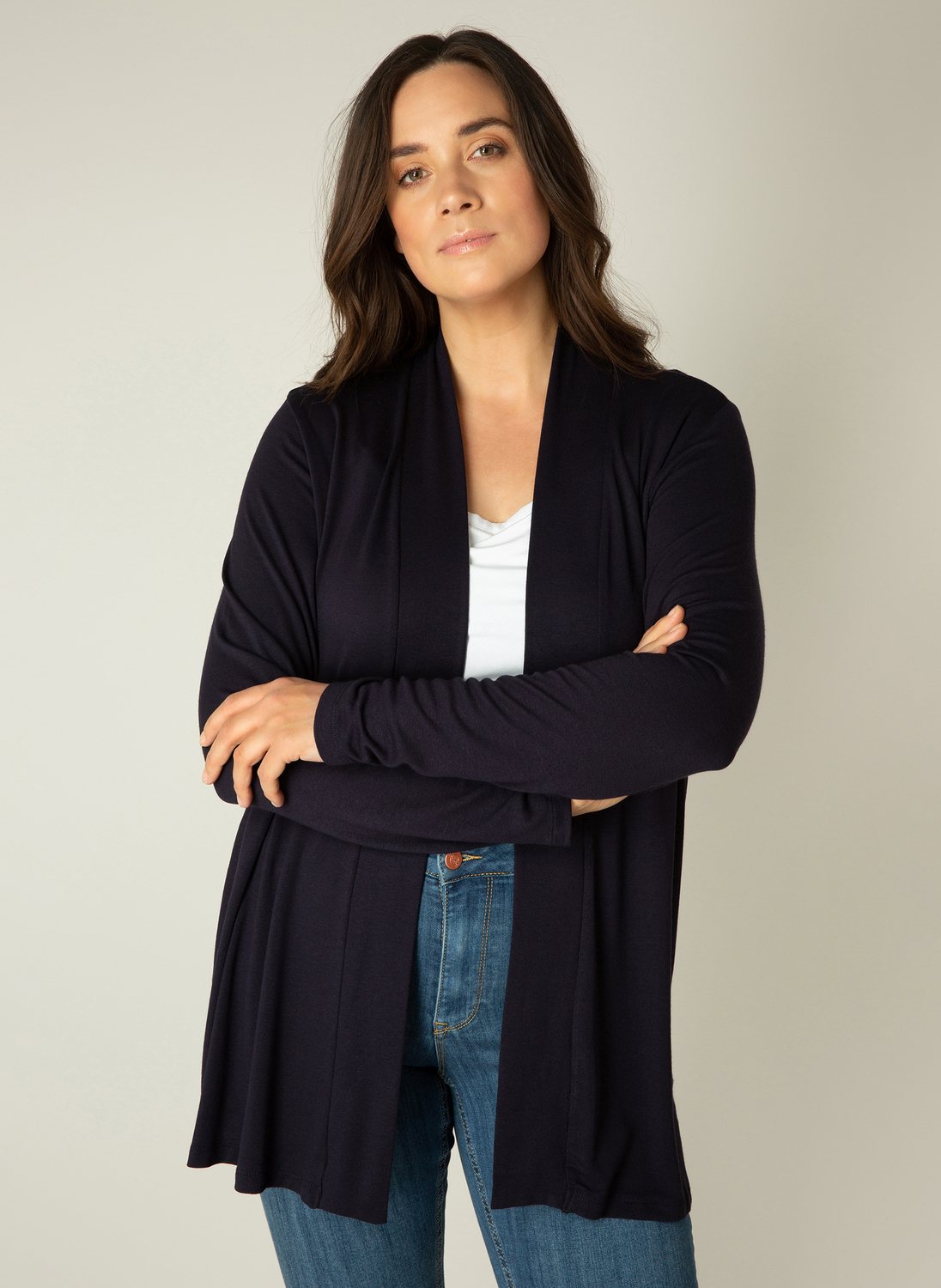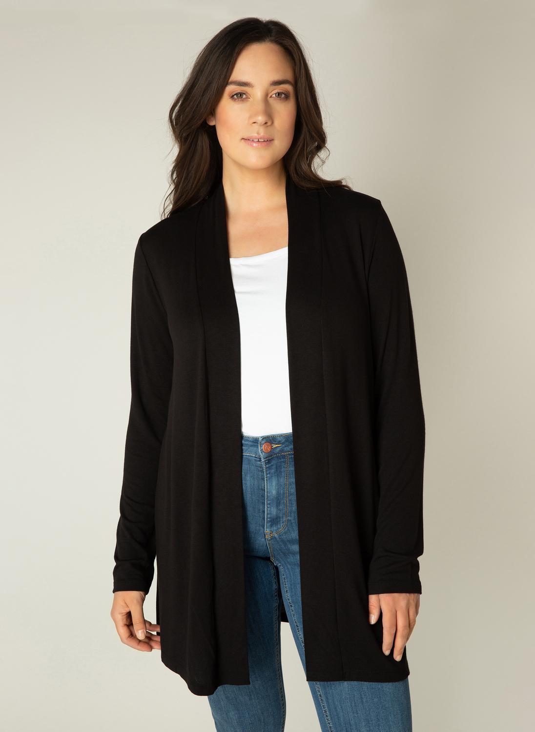 Vest Ayla van Base Level Curvy is een medium lang vest gemaakt in een zachte viscosemix. Het vest heeft lange mouwen en valt open. Dit item is 80cm lang.