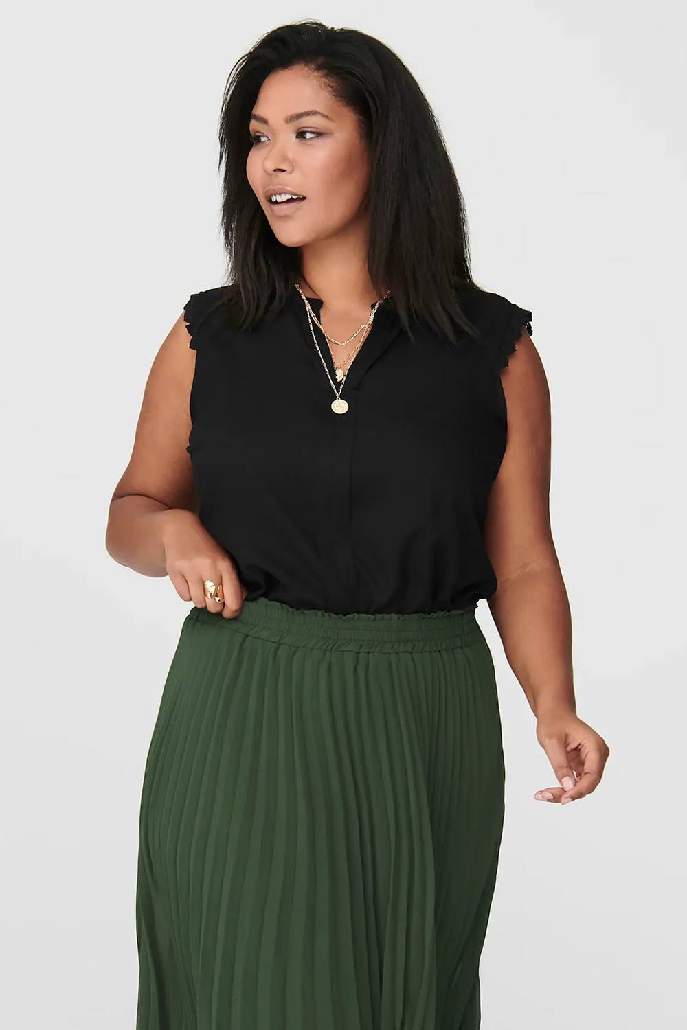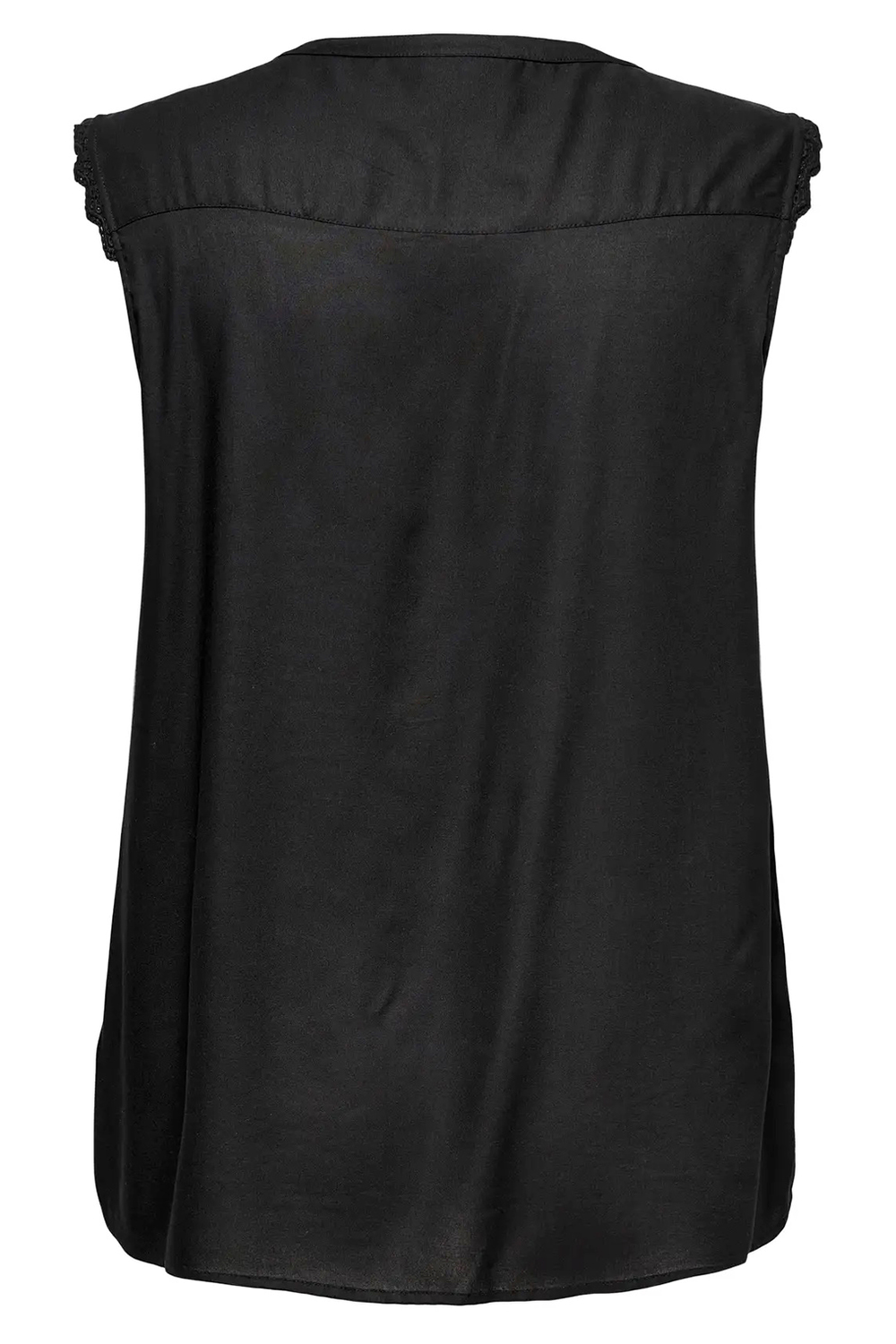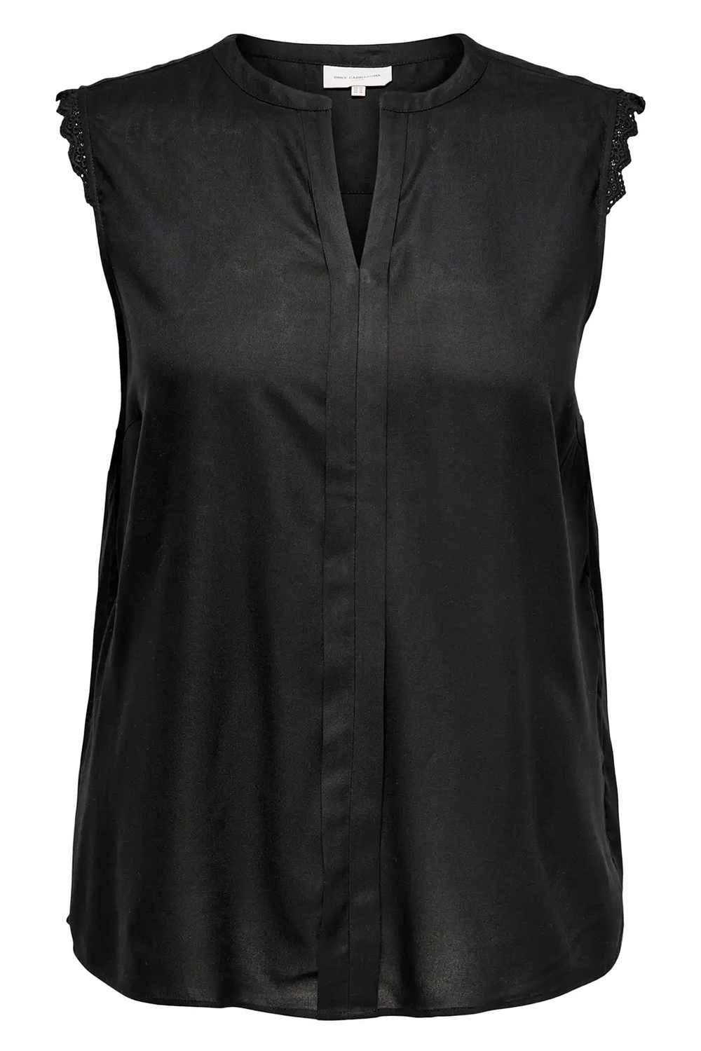 Wat een super mooi blousje van ONLY Carmakoma voor een super leuke prijs. De blouse is mouwloos en heeft op de kop van de schouder een fijn kant randje. De ronde hals heeft een heel smal boordje en een V split. Deze split loopt door in een middenvoor naad met een naar buiten toe liggend beleg.
