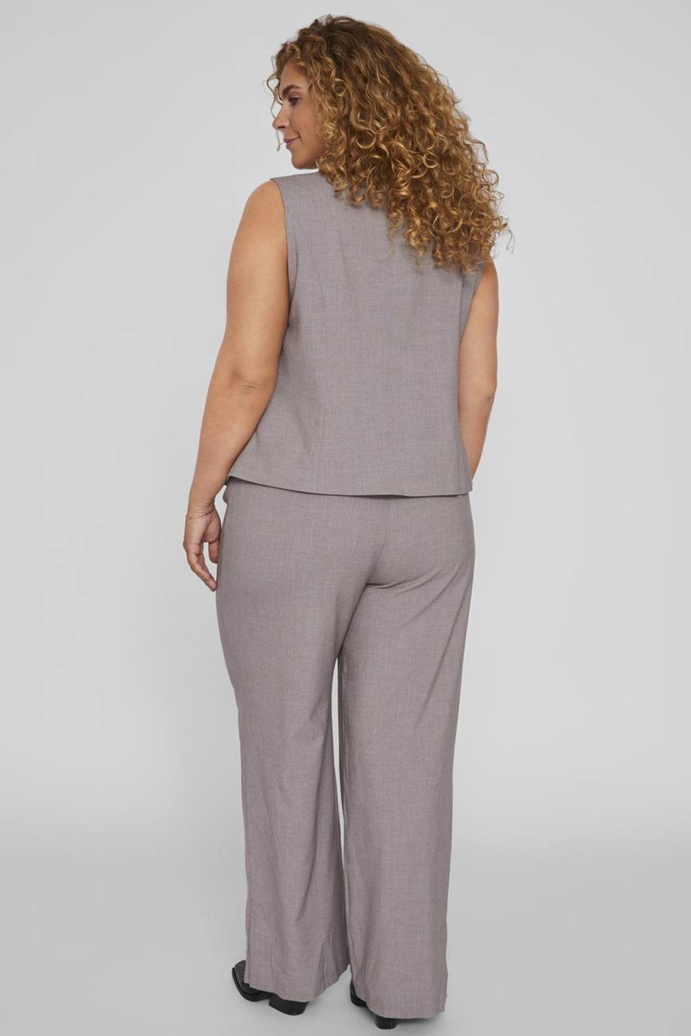 EVOKED VILA broek TANI is een halfwijd model met een vaste tailleband voor en elastiek in de achtertaille. Hij heeft riemlussen en helaas geen zakken, wel paspelzakjes in het achterpand. Hij valt mooi lang en hij heeft splitten van 14cm in de zij ondernaad. Het bijpassende gilet is artikel 14093451 en de blazer 14093453.