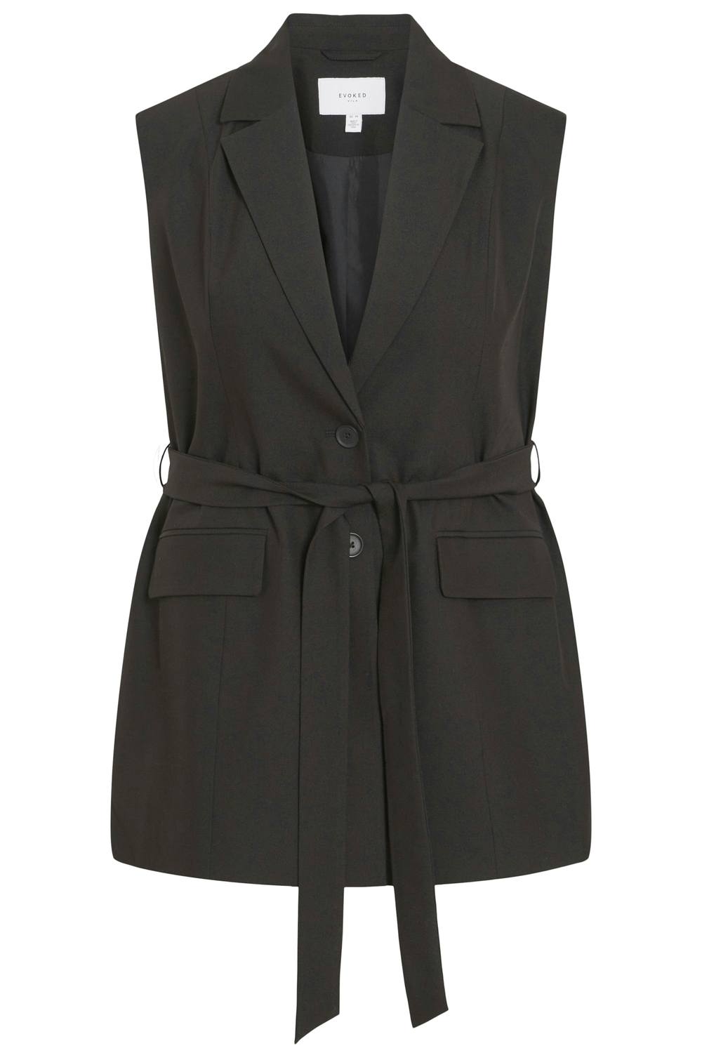 EVOKED VILA gilet MURAM is geheel gevoerd. Hij sluit met 2 knopen en heeft een extra strikceintuur in de taille. Hij heeft een mooie diepe reverkraag en in het voorpand zitten klepzakken. Voor de zakelijke look mooi om te combineren bij de rok van Evoked 14100474. Of je combineert dit model met een goede jeans voor de stoere look.