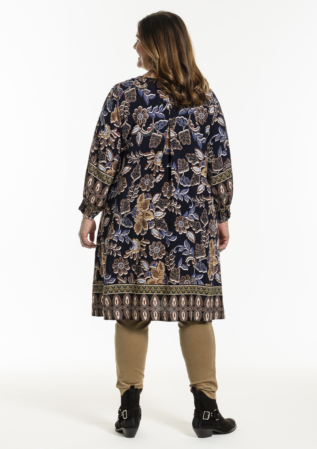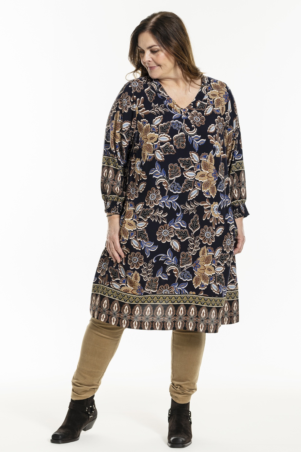 Gozzip tuniek Meta heeft een mooie V hals met een iets breder beleg. Hij heeft lange mouwen met smock elastiek. Het is een Alijn model met zakken in het voorpand. Leuk te combineren met een leatherlook legging of panty.