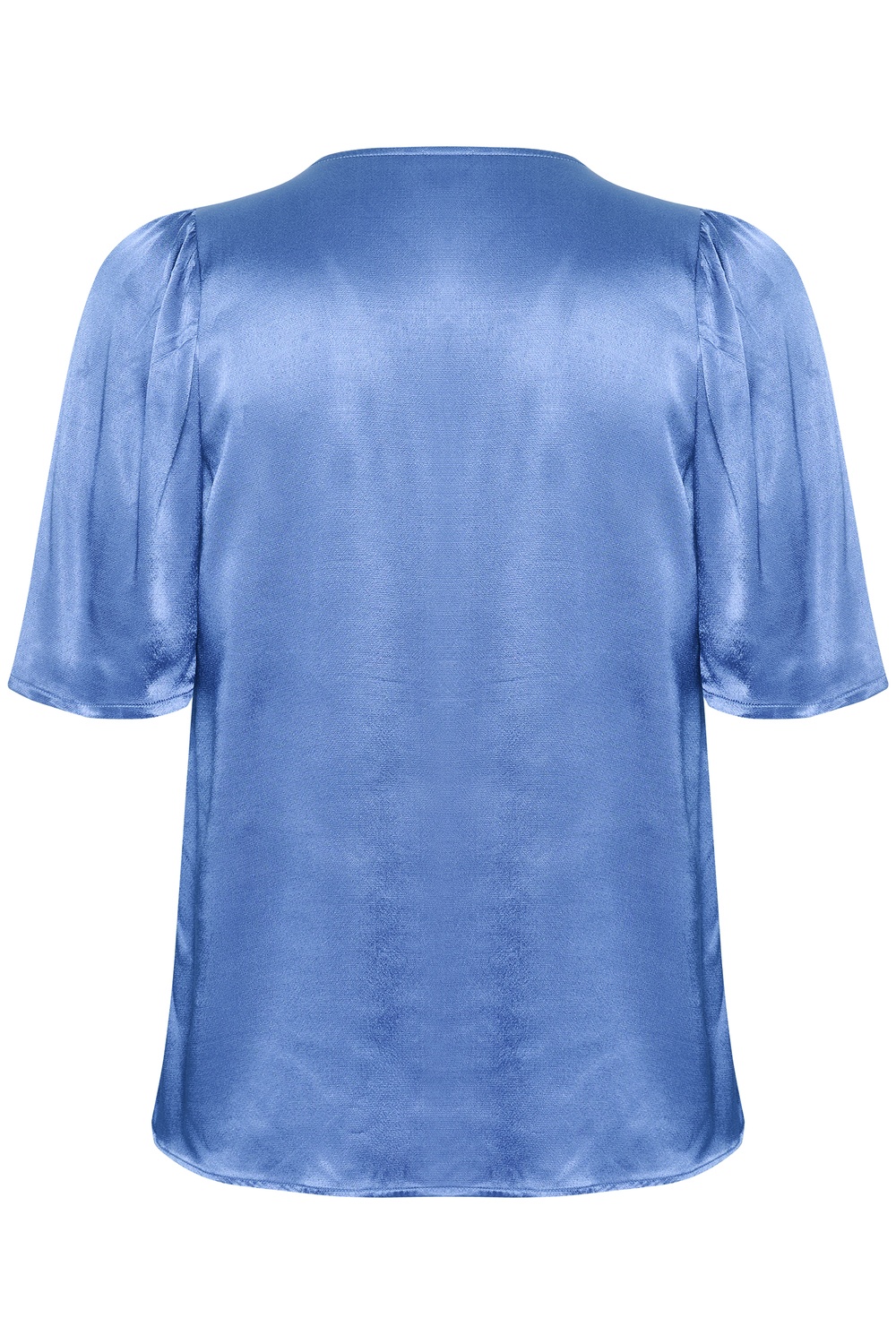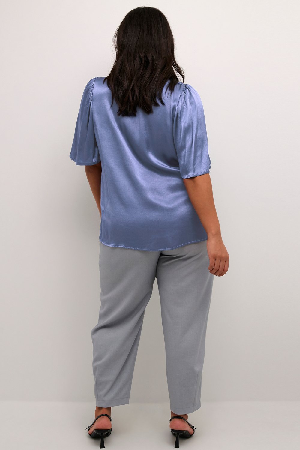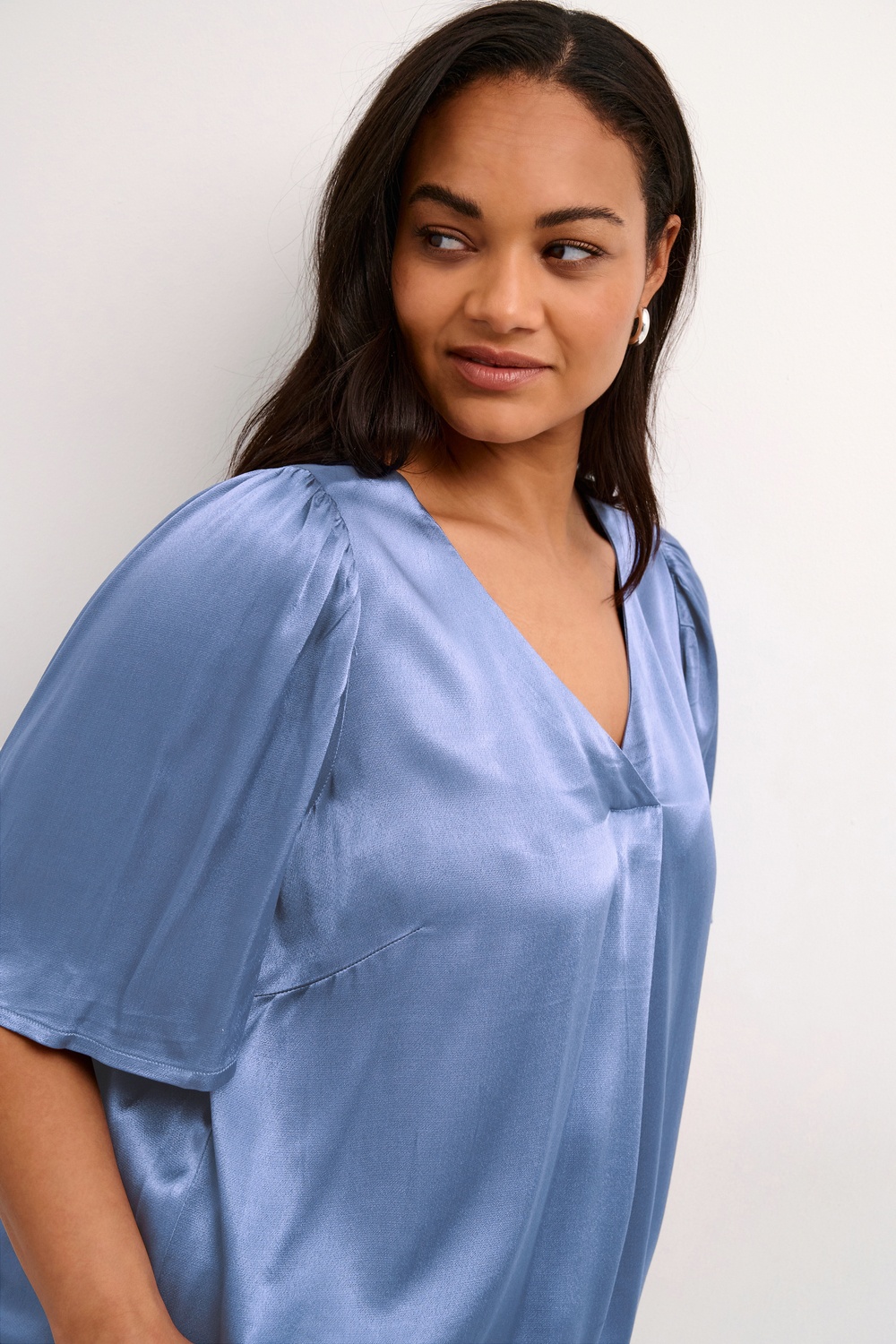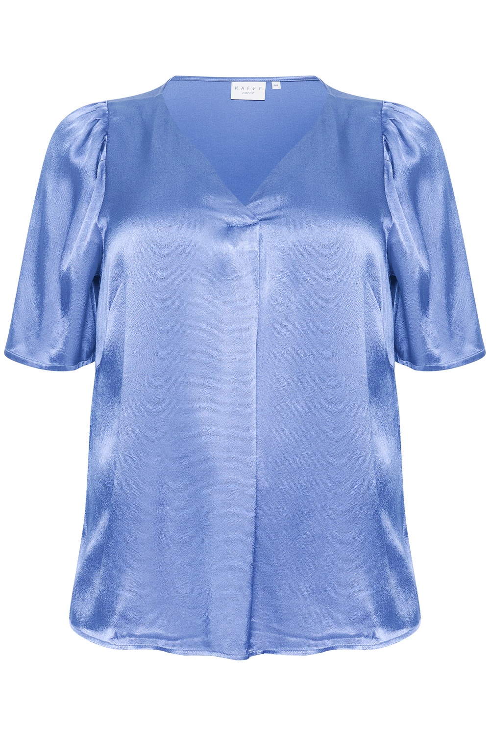 Kaffe Curve blouse Kana  is gemaakt in een super mooie stof met satijn glans. De blouse heeft een V hals met daaronder een platte plooi. Zo heb je meer ruimte over de buste. Hij heeft een uitlopende korte mouwe die gerimpeld is op de kop van de mouw. De stof voelt wat zwaarder aan en valt hierdoor mooi. Op de foto is hij gecombineerd met de broek 10582231.