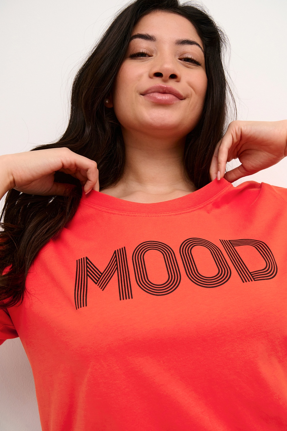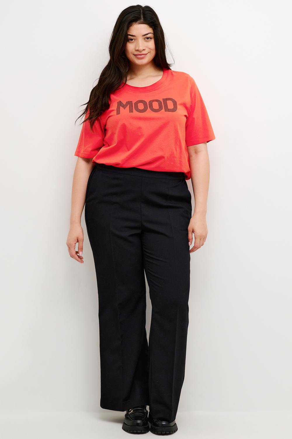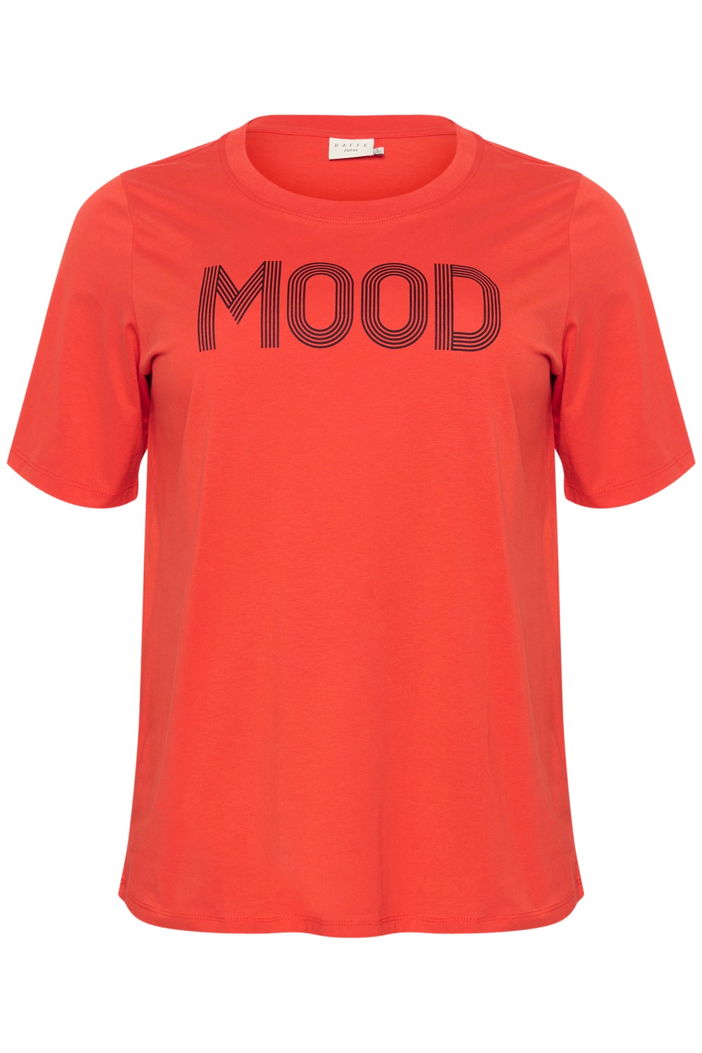 Kaffe Curve shirt Molli  heeft een zwarte opdruk op de voroaknt met de tekst MOOD.  Het is een basis model shirt met ronde hals en korte mouwen. We hebben hem gekozen omdat hij super staat bij de broek 10582568. Deze komt binnenkort binnen.