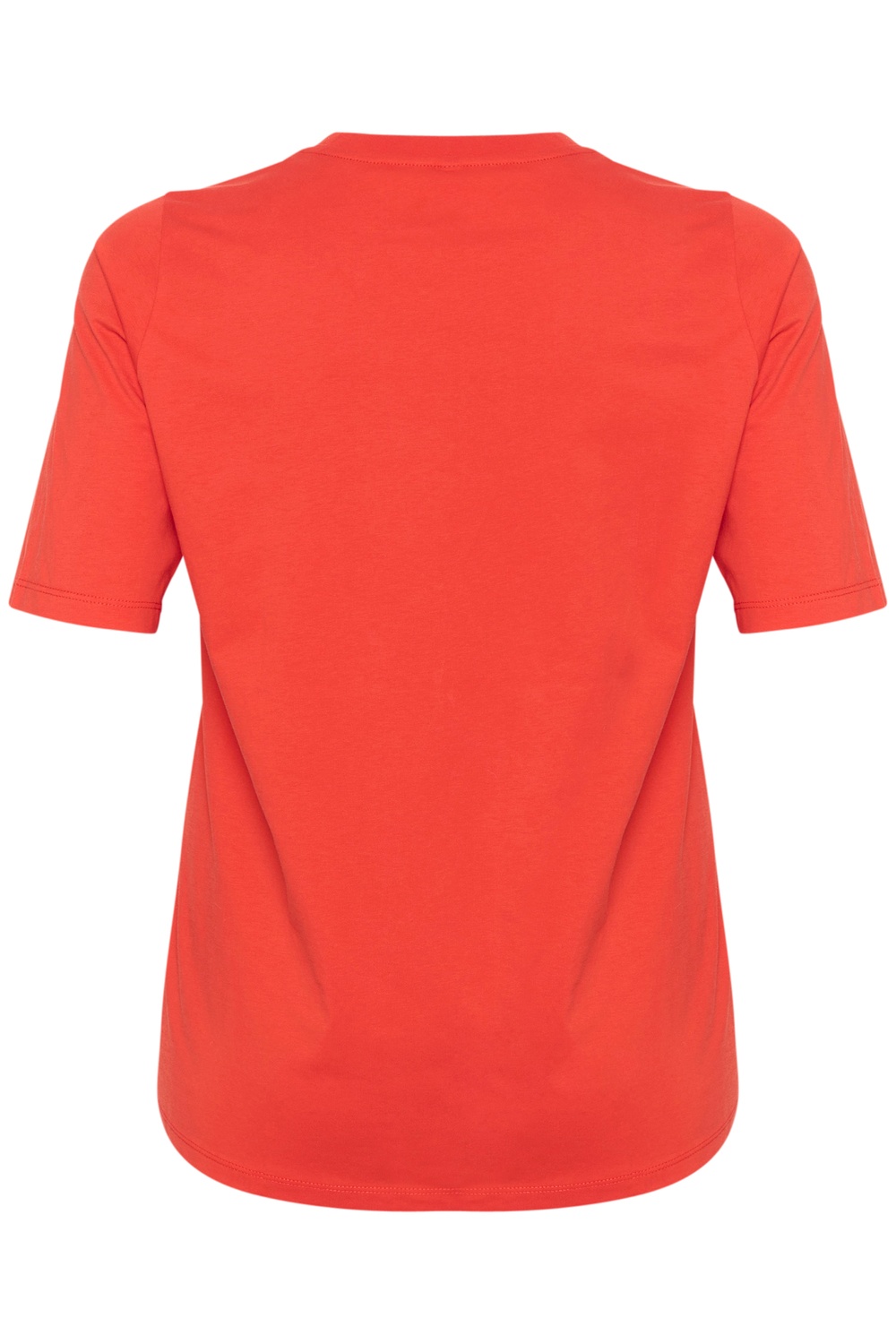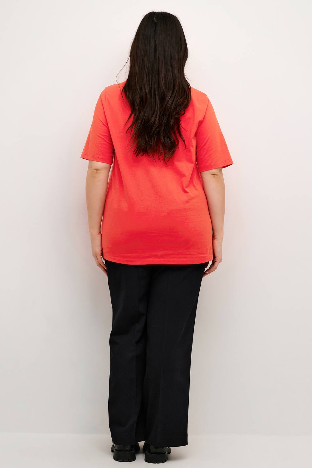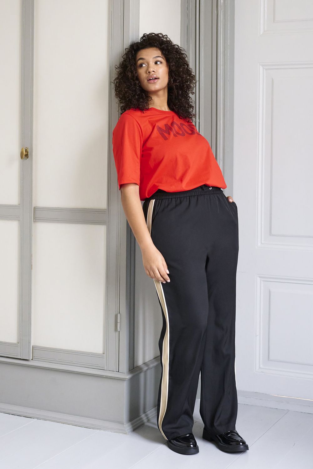 Kaffe Curve shirt Molli  heeft een zwarte opdruk op de voroaknt met de tekst MOOD.  Het is een basis model shirt met ronde hals en korte mouwen. We hebben hem gekozen omdat hij super staat bij de broek 10582568. Deze komt binnenkort binnen.