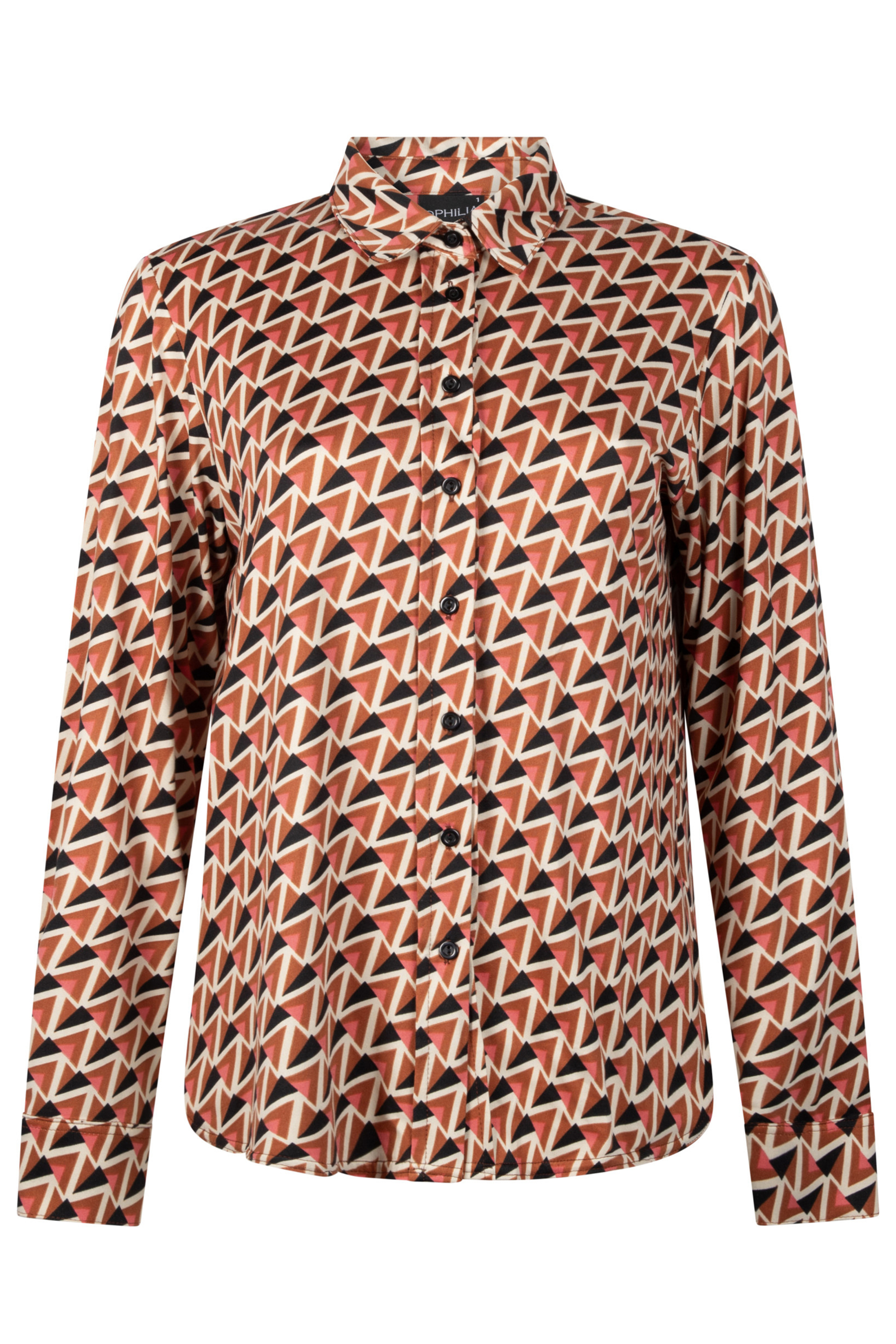 Ophilia blouse Dewi dessin is een wat korter model blouse, met kraagje, sluit met knoopjes en heeft lange mouwen met een manchet. De stof voelt prettig aan en heeft een goede rek. Er is een bijpassende broek, model Andre 24W dessin.