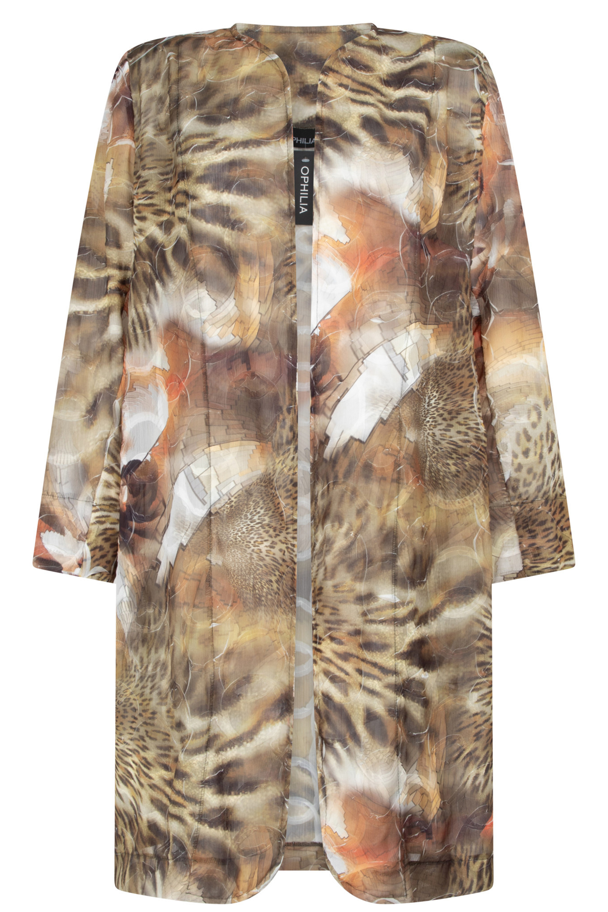 Ophilia jasje Helen dessin is een losvallend model gemaakt in een voile stof met een structuur. Op de stof zitten bandjes gestikt in cirkels en na produktie is de stof geverfd, waardoor je onder de gestikte cirkels wit ziet. Het is een losvallend model.