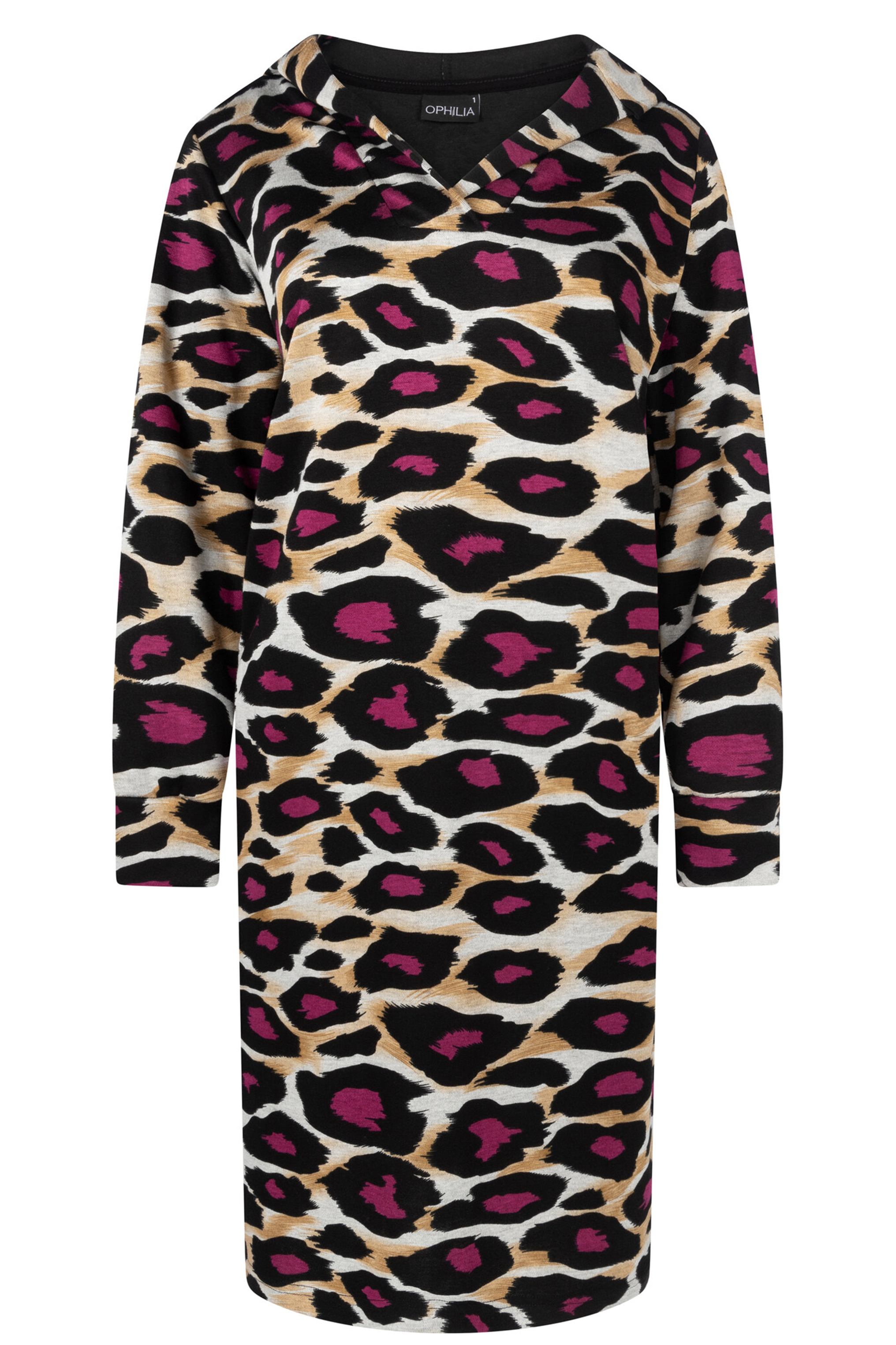 Ophilia jurk Ivana print is een super vlot model door de capuchon en V hals met overslag. Hij heeft lange mouwen met een brede boord en in de zijnaad zitten zakken. De lengte valt over de knie, dus leuk te combineren met de leatherlook legging Suna 22S.