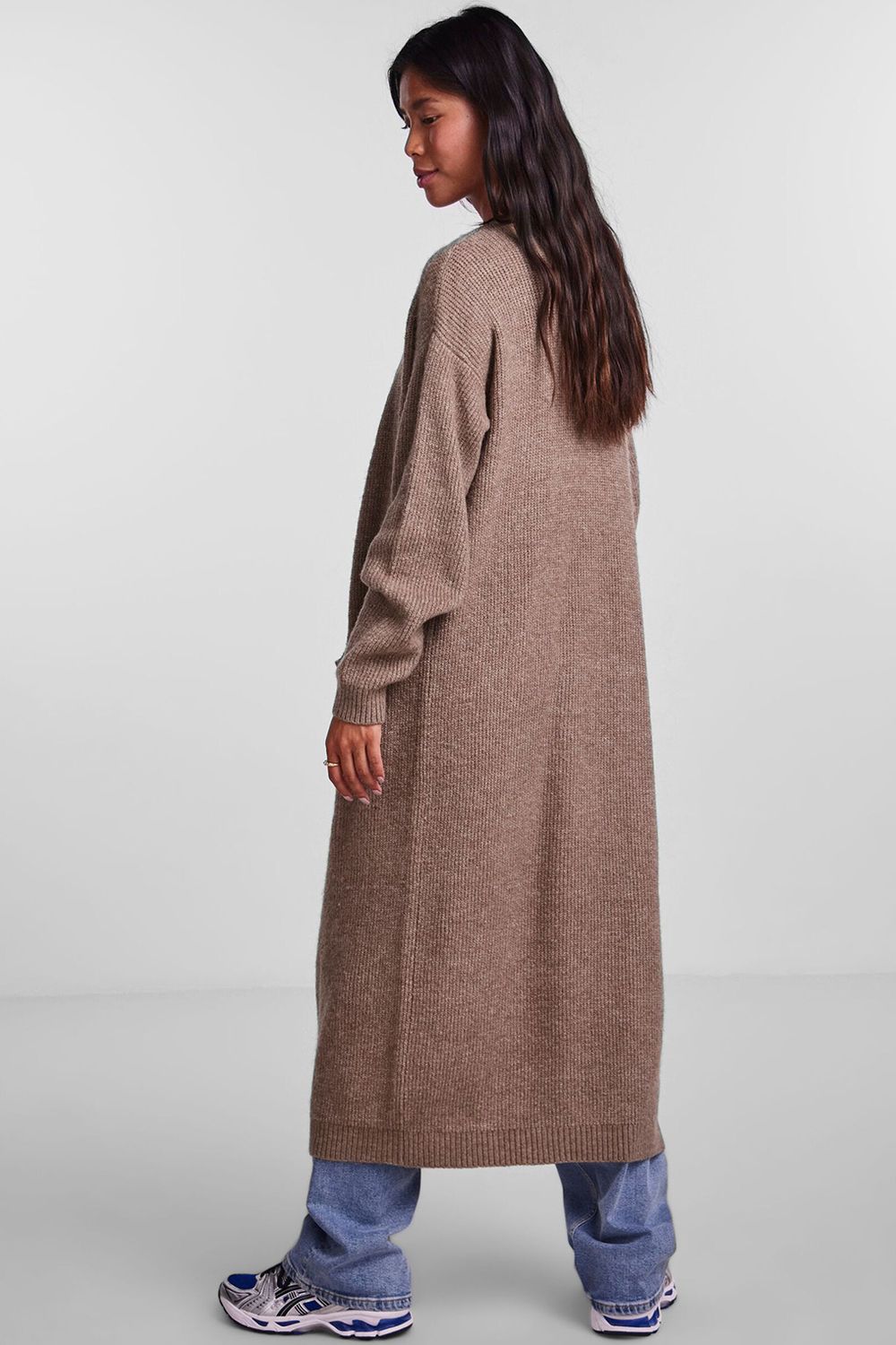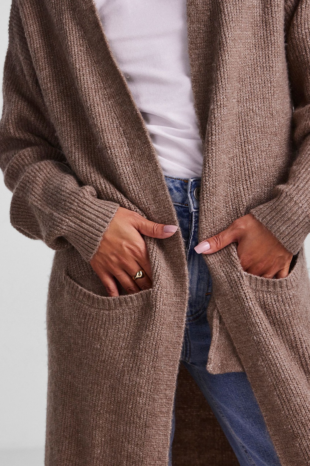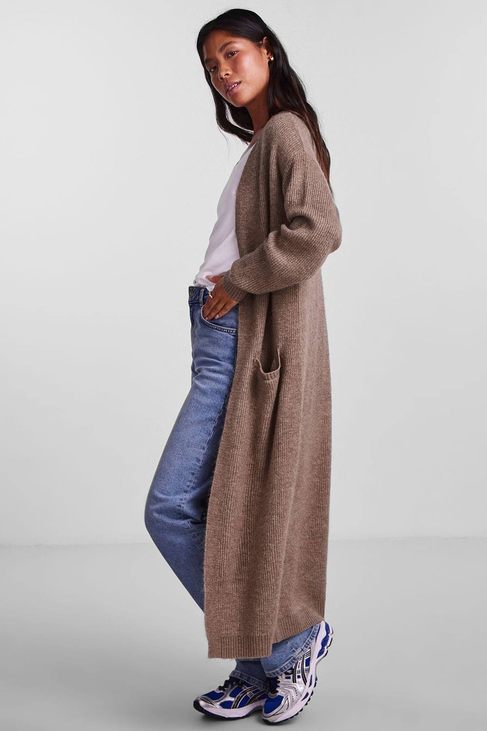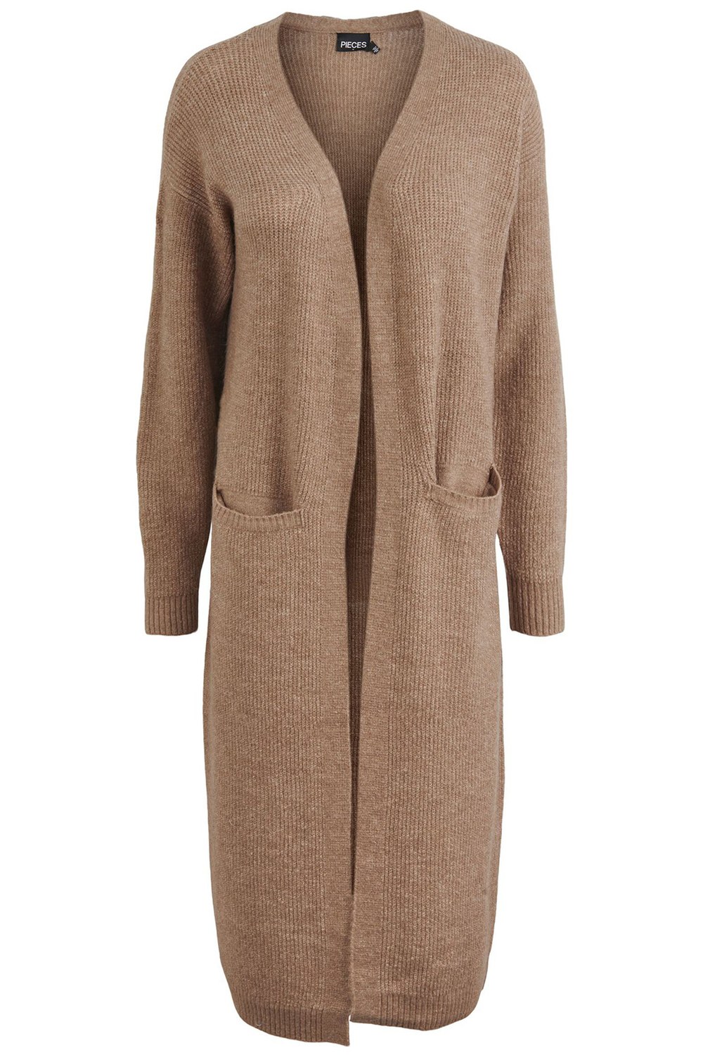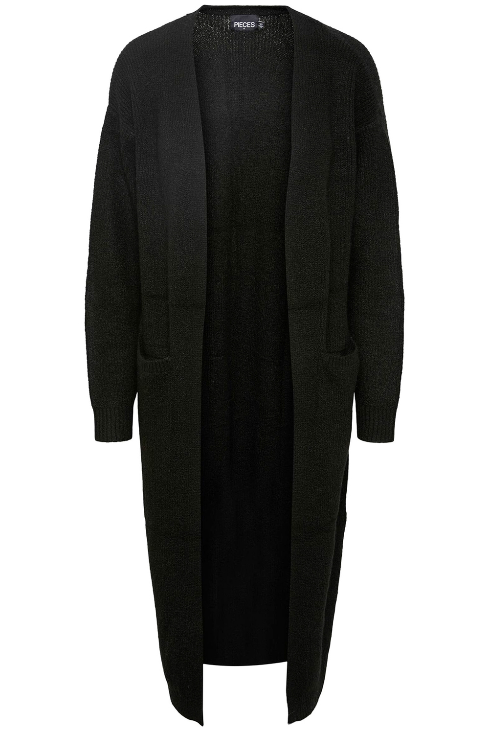Pieces curve vest PCJENNIFER is een lekker lang model. Het vest heeft geen sluiting. In het voorpand zitten ingebreide zakken. Het breisel voelt fijn aan en kriebelt niet. Bij maat S is hij 109 cm lang.