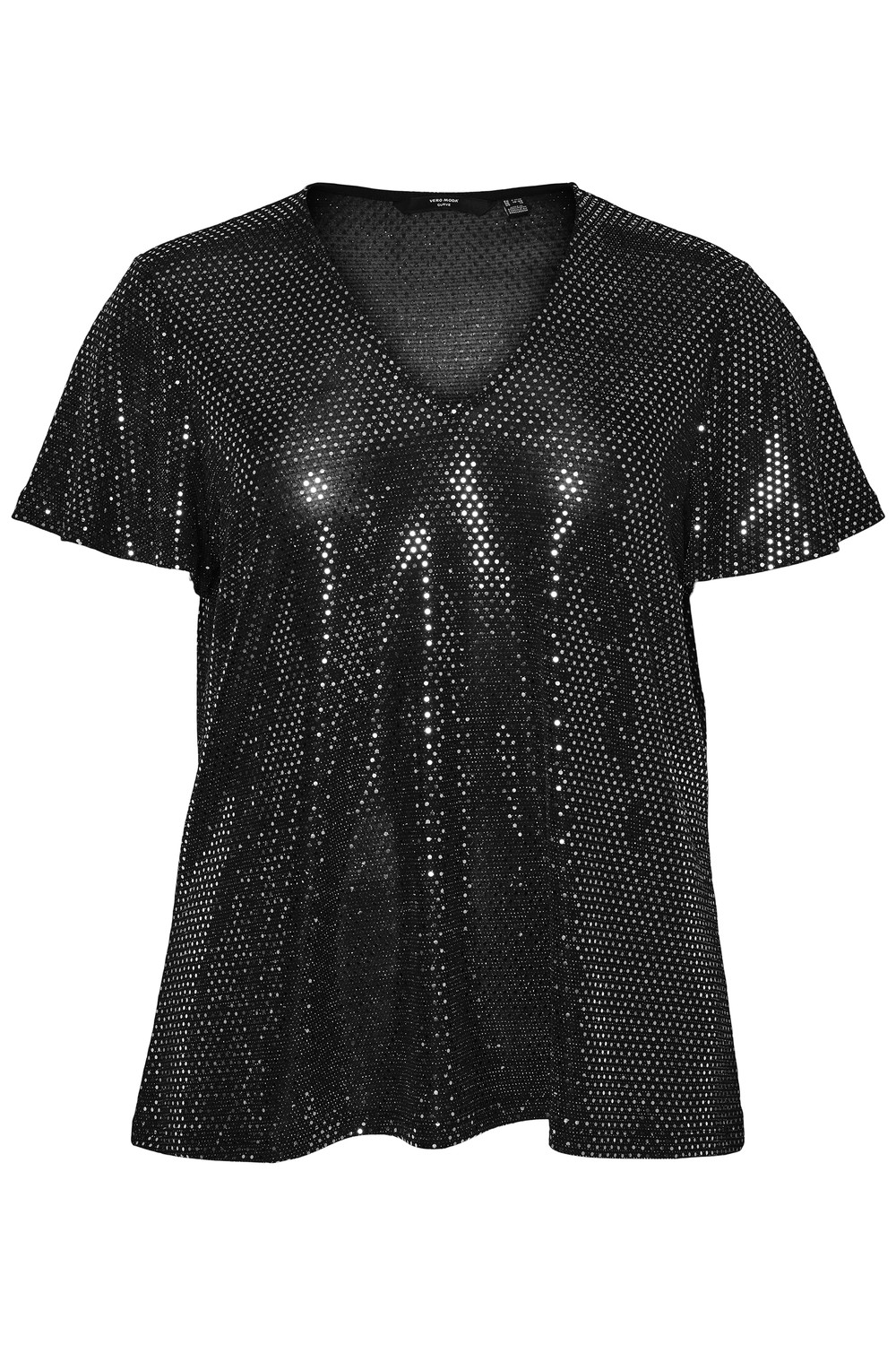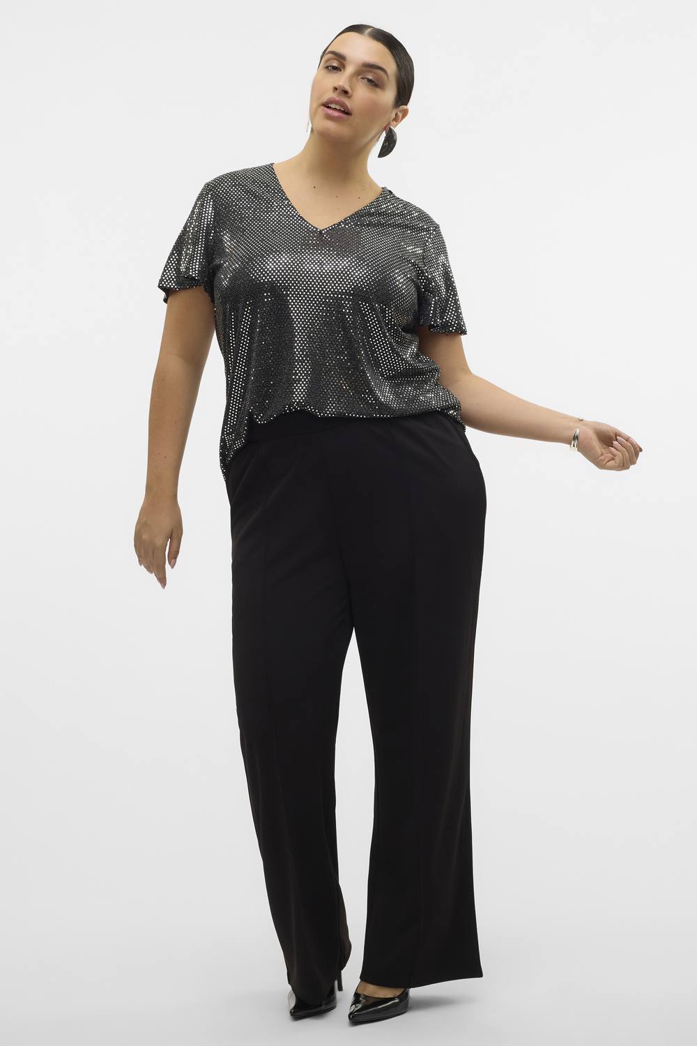 Het VERO MODA Curve Evaline shirt is een sprankelende toevoeging aan je garderobe, gemaakt van een super glitterstofje met een prachtige pailletten look. Het shirt heeft een V-hals en loopt licht uit voor een flatterend silhouet, terwijl de korte mouwen iets wijder vallen voor een speels effect.