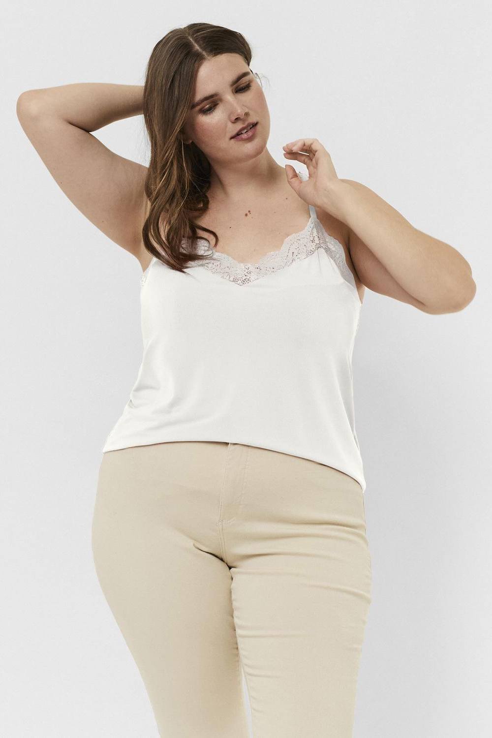 VERO MODA curve singlet VMANA is echt een plaatje. Hij heeft zowel aan de voor als achterkant een prachtig kant detail. Middenachter zit er een knooppad met stof knoopjes. Het singlet valt wat korter en heeft een lichte A lijn pasvorm. De lengte is bij maat S 69 cm. Hij is gemaakt in een ECO vriendelijk tricot. Je vindt al onze singlets in de categorie grote maten singlets.