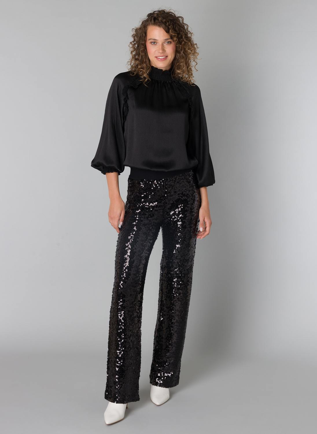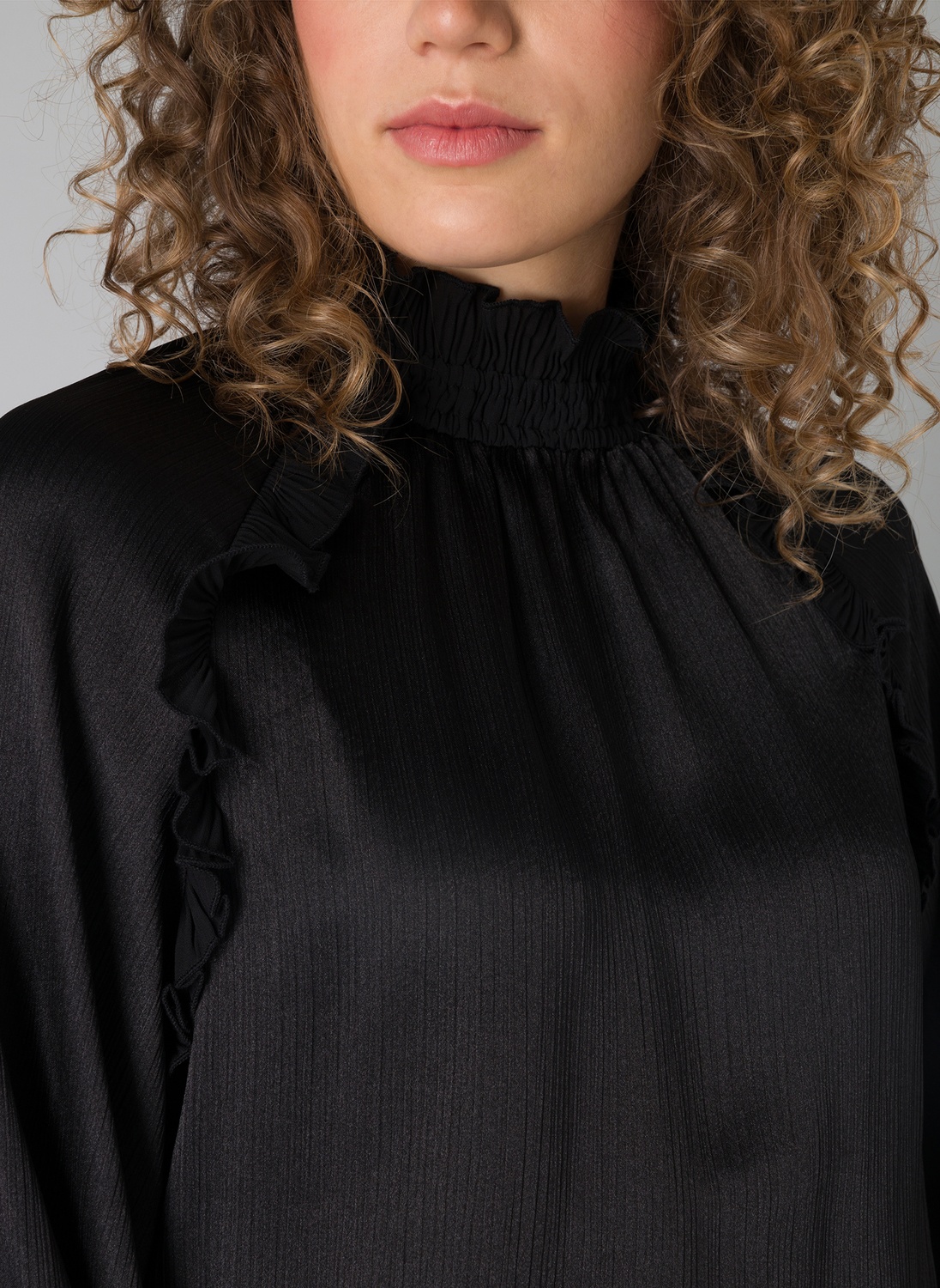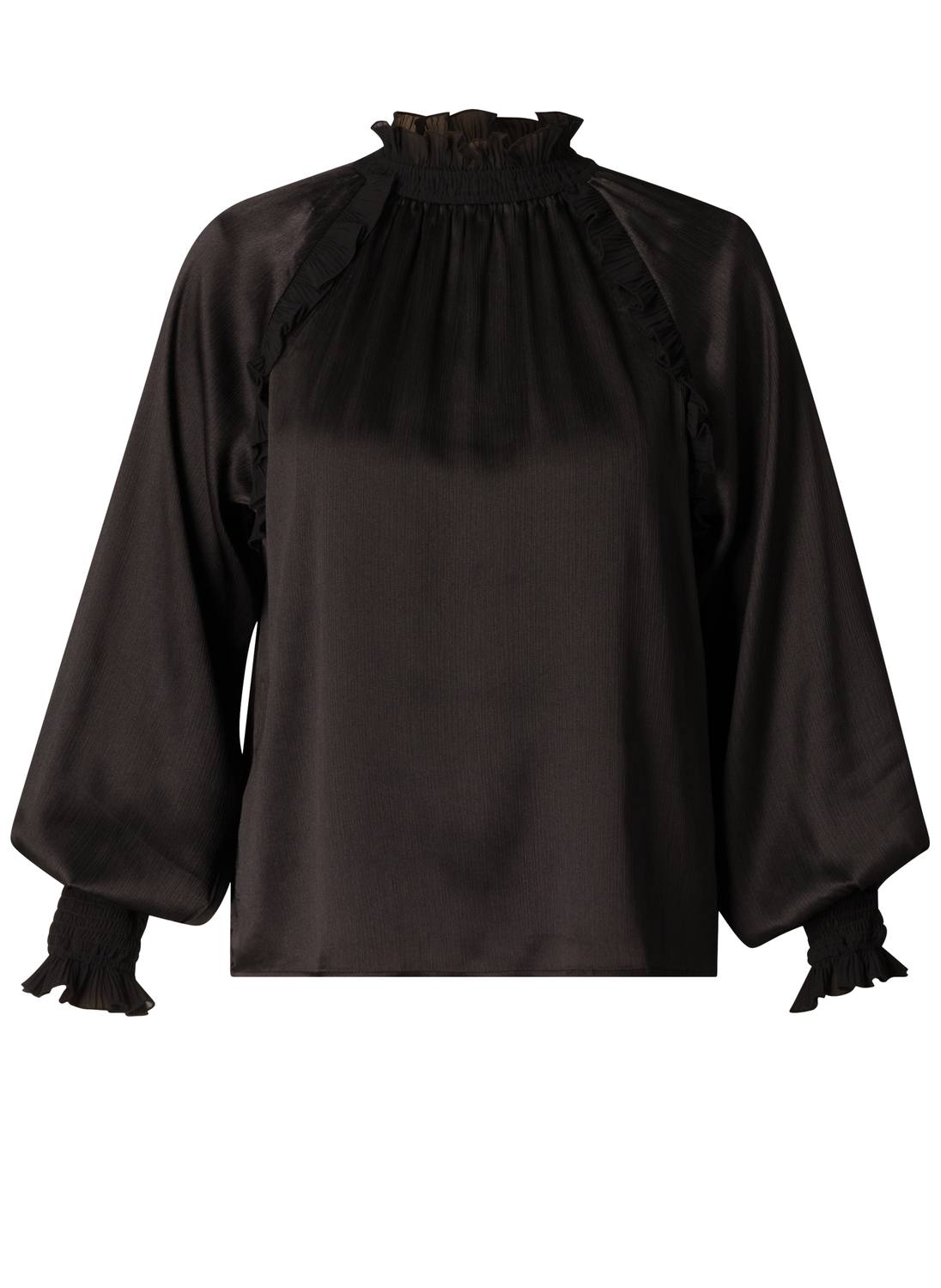 Maak een stijlvolle indruk met de Yest Palma blouse in diepzwart, met een lengte van 63 cm die perfect valt over de taille voor een flatterend silhouet. De blouse heeft een subtiel shiny finish, een ruffled hoge neklijn en manchetten voor een elegante touch, terwijl de wijde mouwen een speels en luchtig effect creëren.