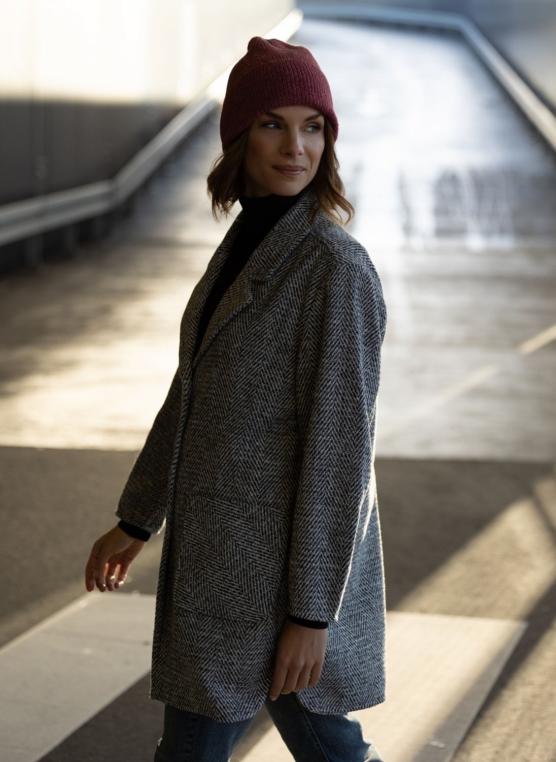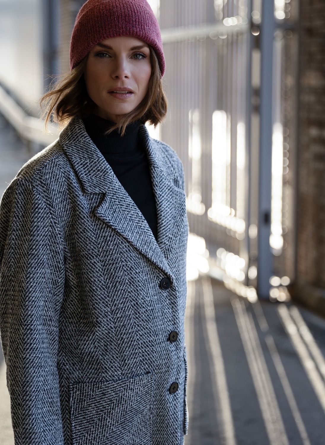 De Nuha jas combineert tijdloze elegantie met moderne functionaliteit. Gemaakt van een jacquard geweven stof in een klassiek zwart-wit dessin, biedt deze jas een stijlvolle toevoeging aan je herfstgarderobe. Het blazermodel met revers en opgestikte zakken geeft een eigentijdse twist, terwijl de ongevoerde afwerking hem ideaal maakt als tussenjas. Met een Comfort Fit en een lengte van 90 cm is de Nuha perfect voor de overgang naar koudere dagen.