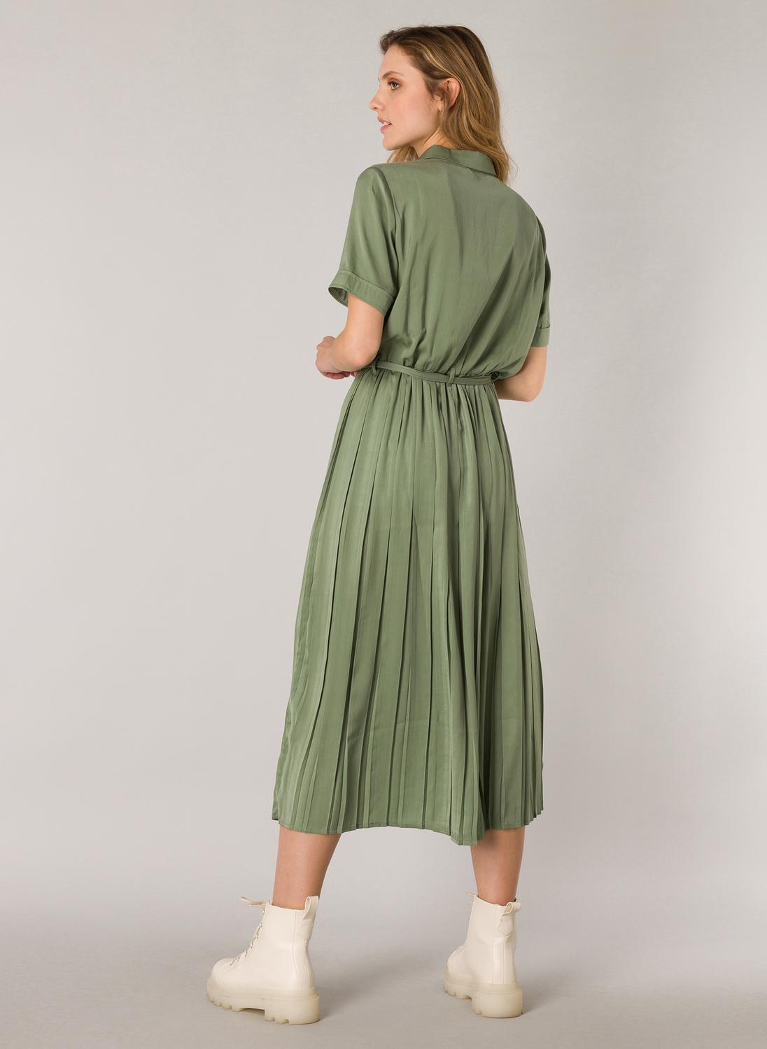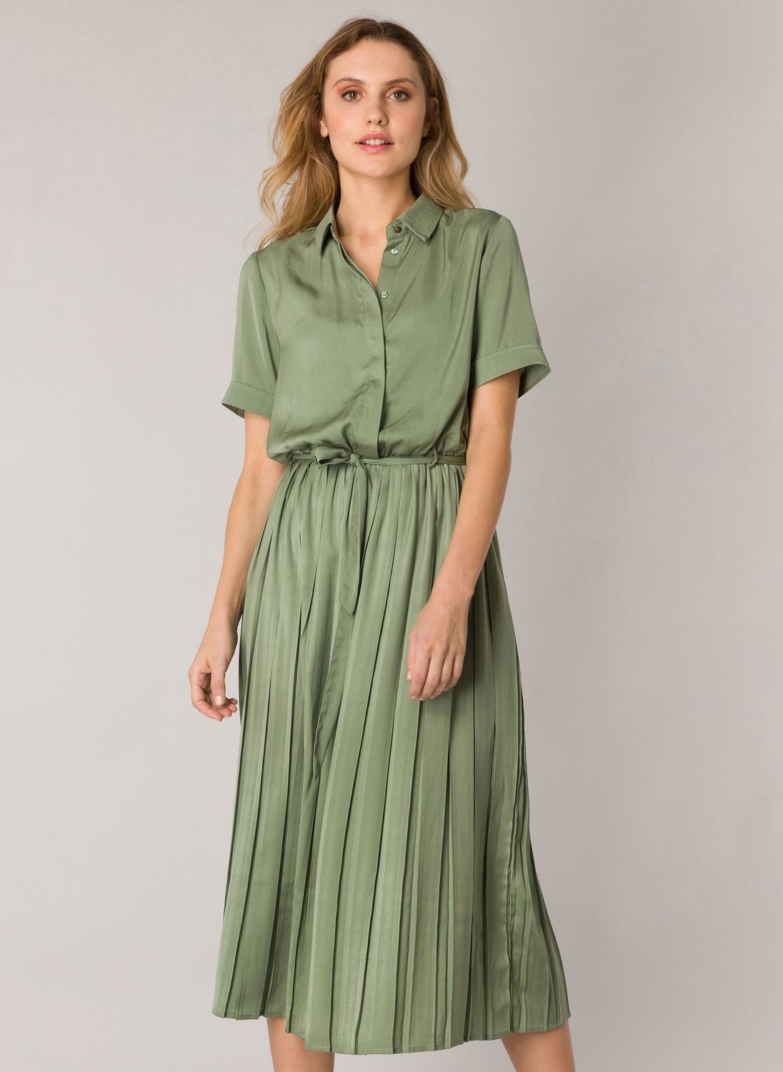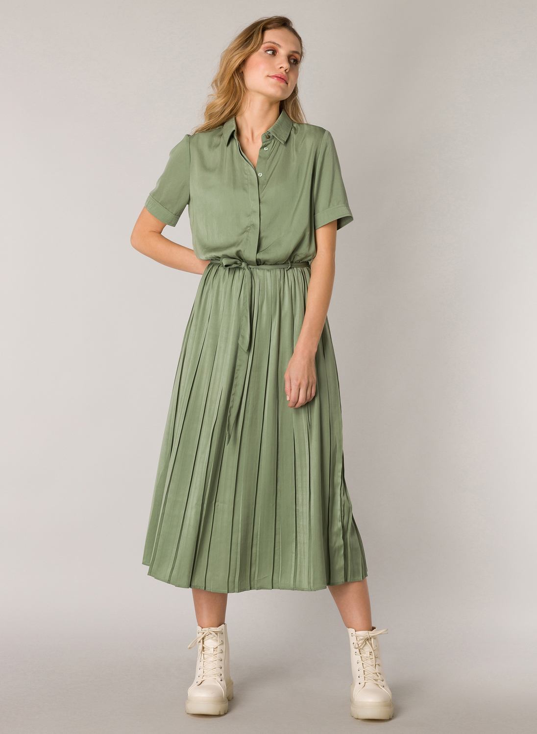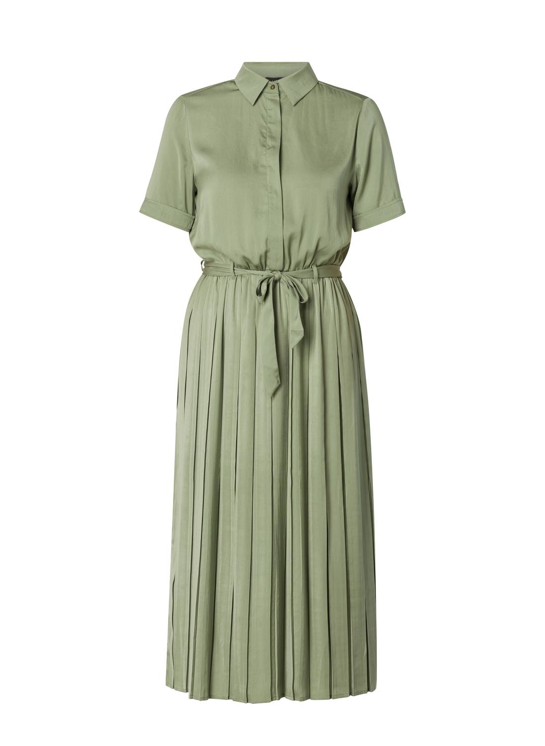 Midi jurk in een soepele glanzende geweven stof. De jurk heeft een klassieke kraag en een blinde knoopsluiting, in de taille riemlusjes met een stoffen ceintuur. De mouwen zijn kort en hebben een kleine omslag. Lengte 128 cm.