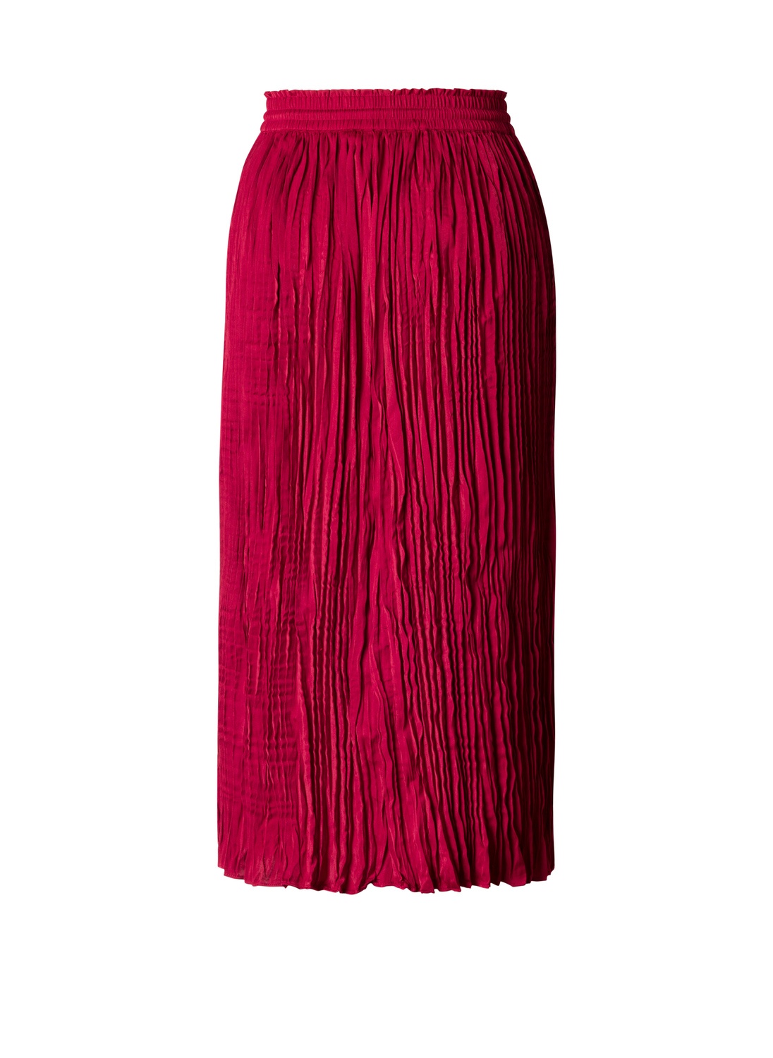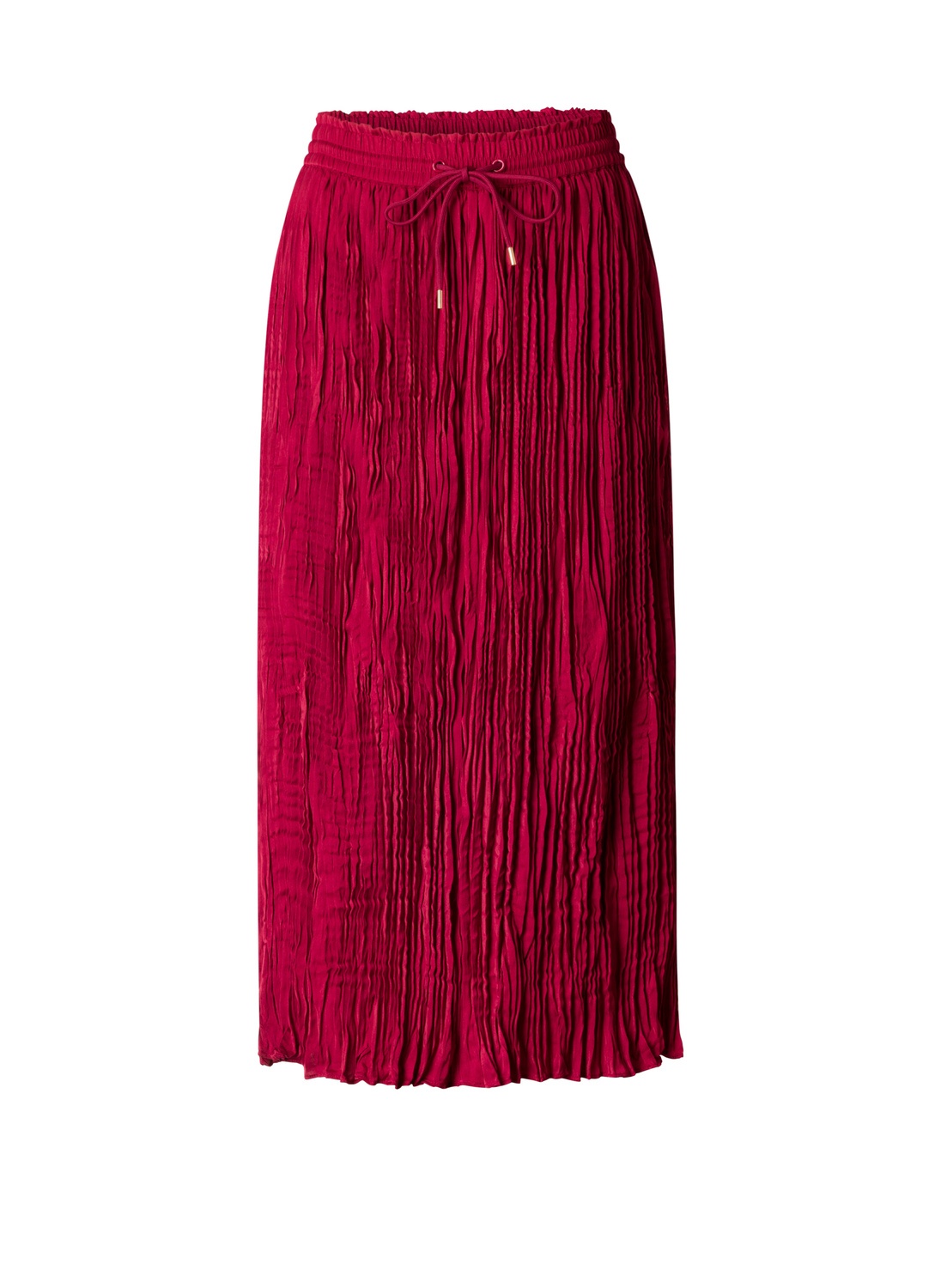 Crinckle plissé rok in de kleur Dark Red. Deze Yest rok heeft een elastische tailleband met een koordsluiting. De Farida Essential is 88 cm lang.
