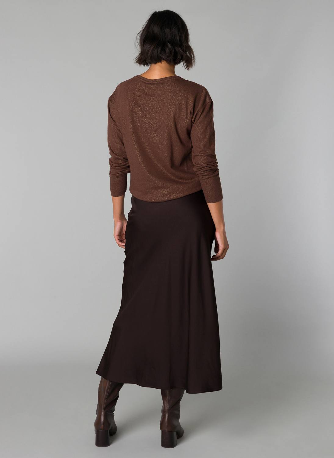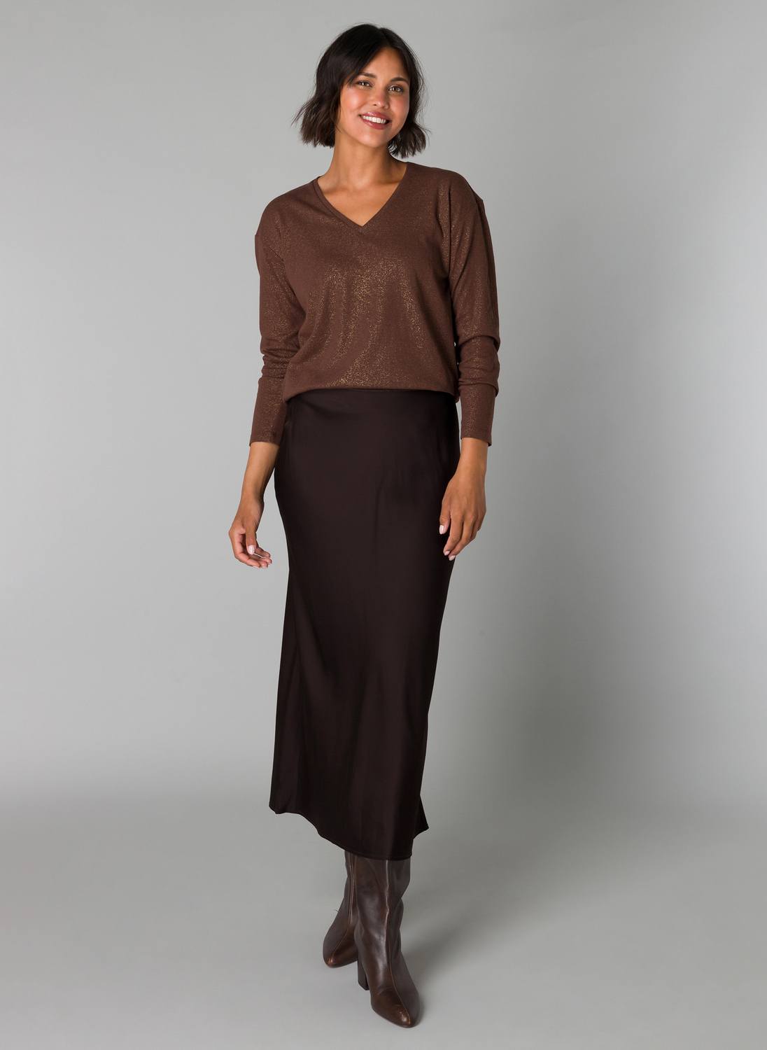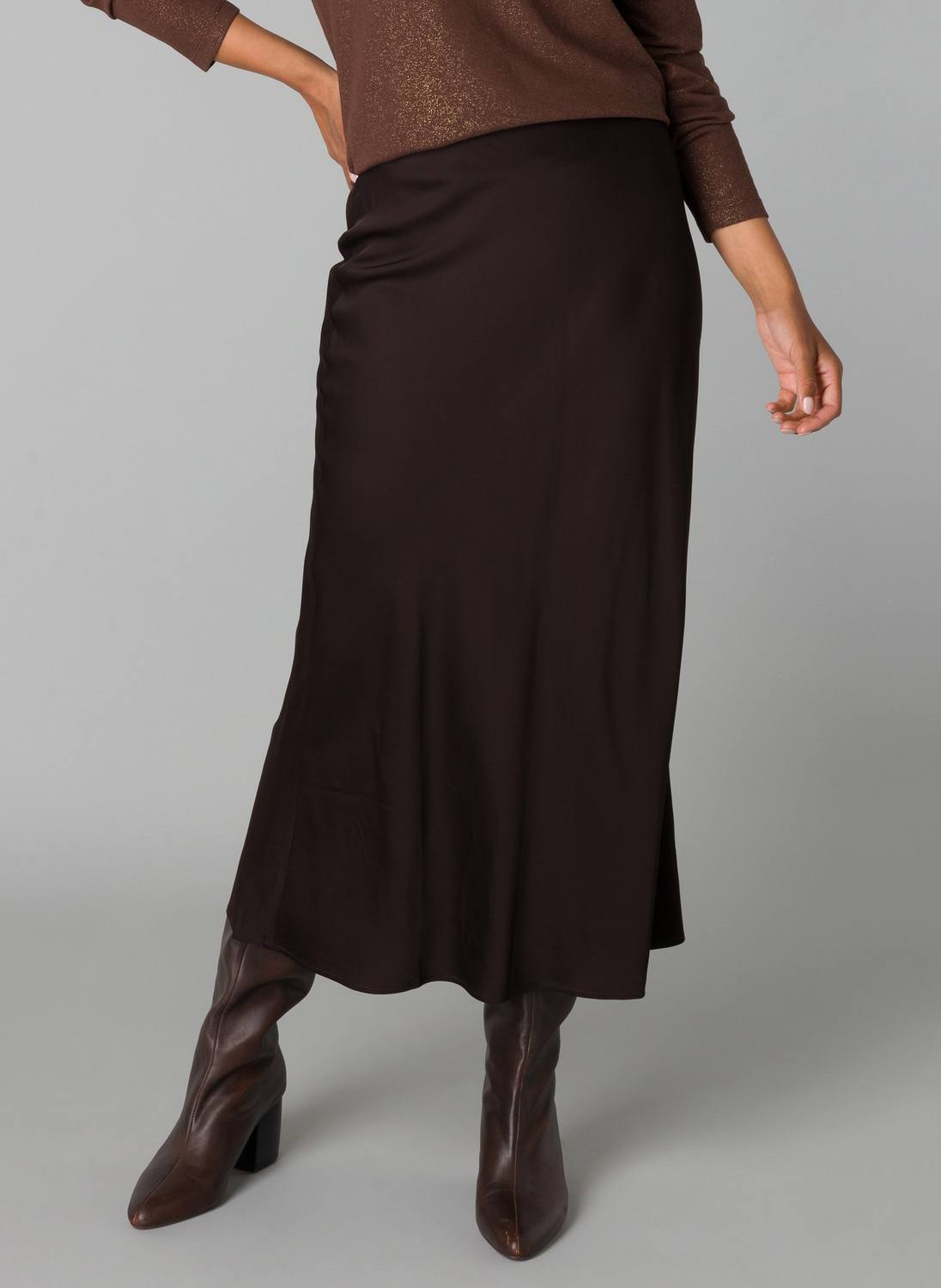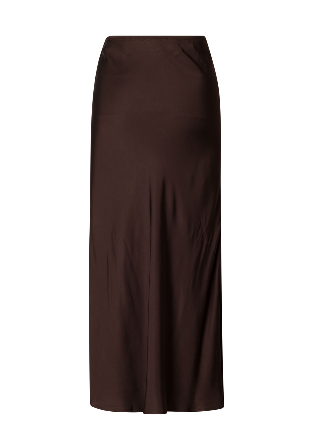 Diep donkerbruine Yest rok met een elegante A-lijn fit. Gemaakt van 100% Viscose en valt tot halverwege de kuit. Draag de Odaymia met een mooie soepelvallende blouse of juist stoer met een grof gebreide trui. Lengte 92 cm.