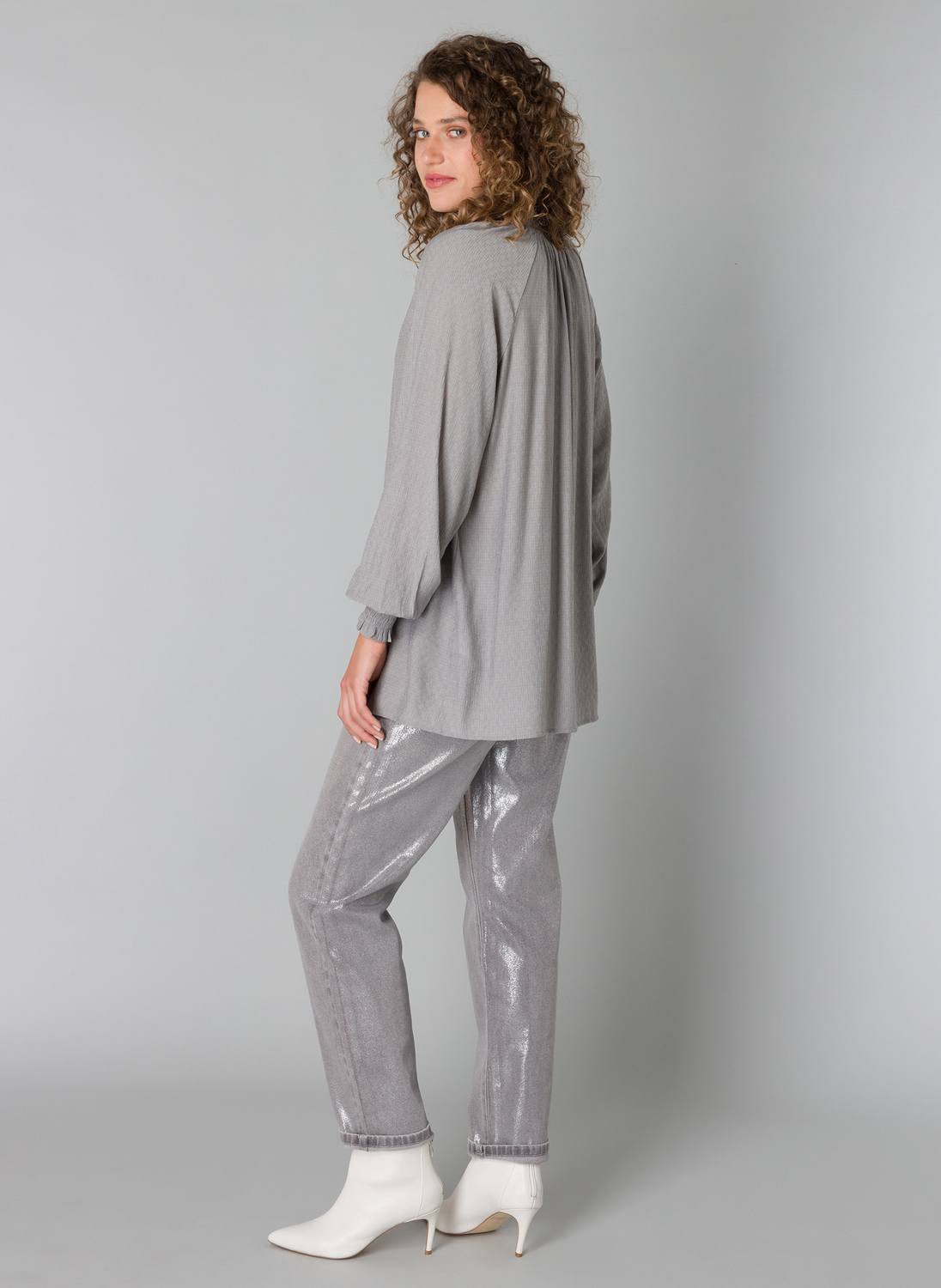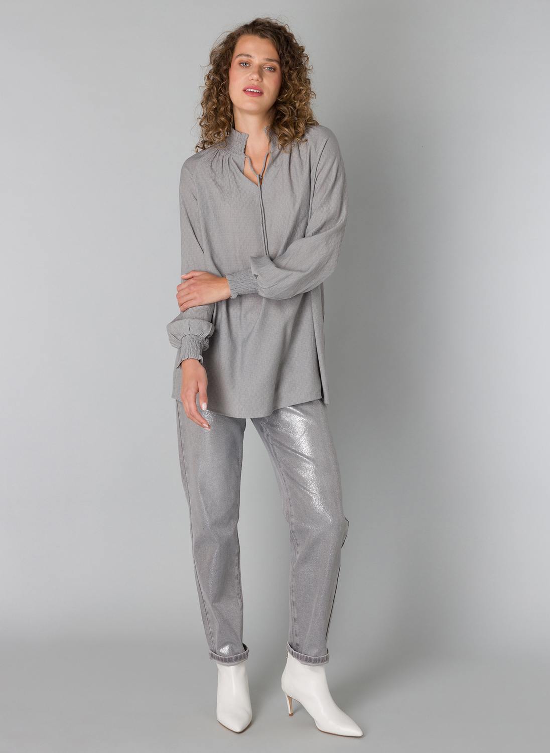 Voeg een vleugje glamour toe aan je garderobe met deze zilverkleurige Yest Curve tuniek, voorzien van subtiele glittertjes voor een sprankelende uitstraling. Het model heeft lange, wijde mouwen met gesmockte manchetten, waardoor er een elegante flair ontstaat die jouw look extra vrouwelijk maakt.