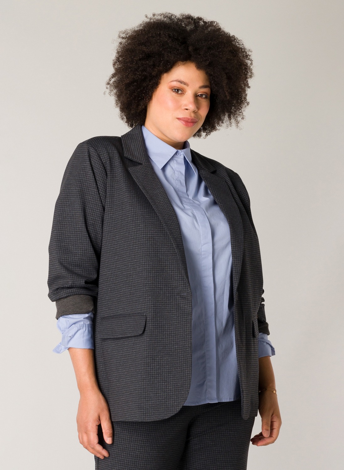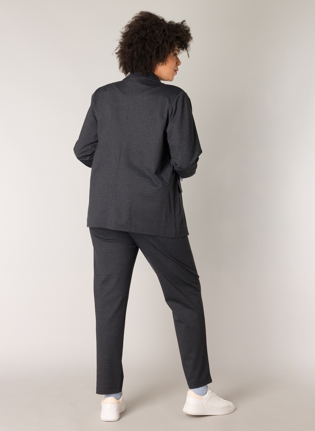 Blazer uitgevoerd in een soepele jersey in een klein ruitje. Het getailleerde model is ongevoerd en heeft een knoopsluiting en 2 klepzakjes aan de voorzijde. Goed te combineren met pantalon A4123 (Roselinde) in dezelfde stof.