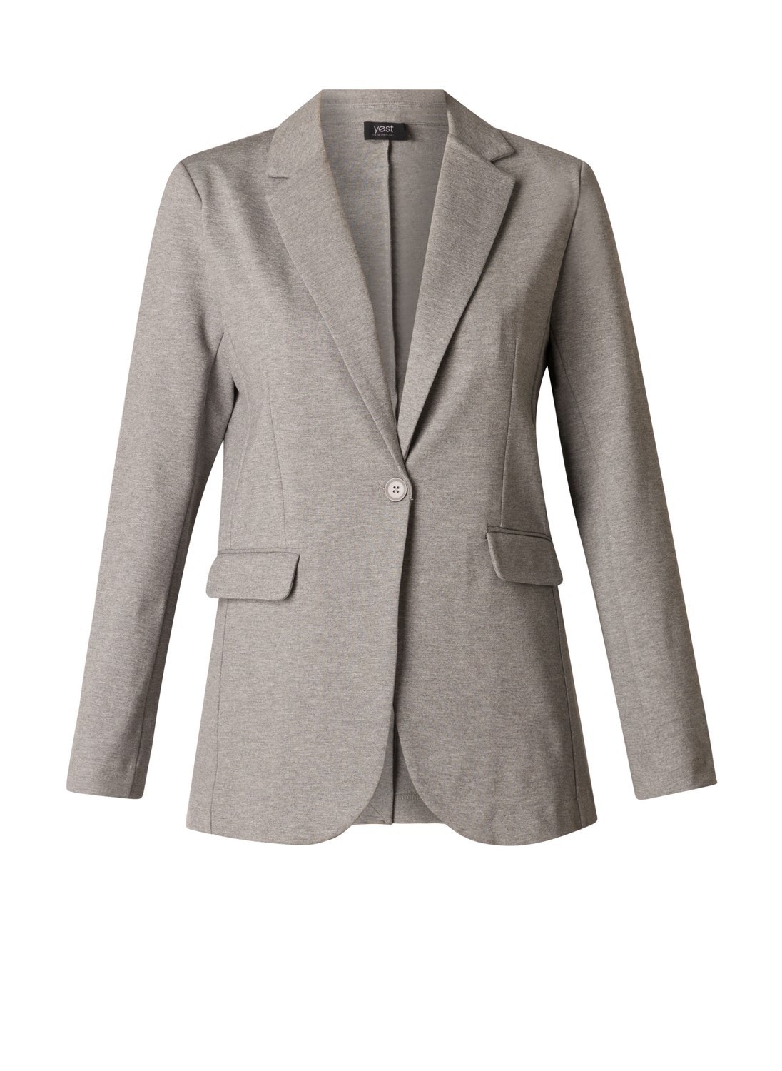 Jersey blazer van Yesta in gemêlleerd grijze stof. Deze vrouwelijke blazer heeft een regular fit en is voorzien van een enkele knoop. De Riven is 78 cm lang. Matcht perfect met bijpassende pantalon, de A004735.