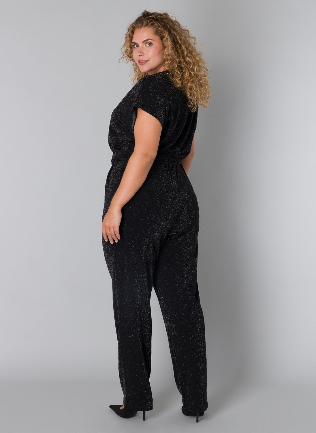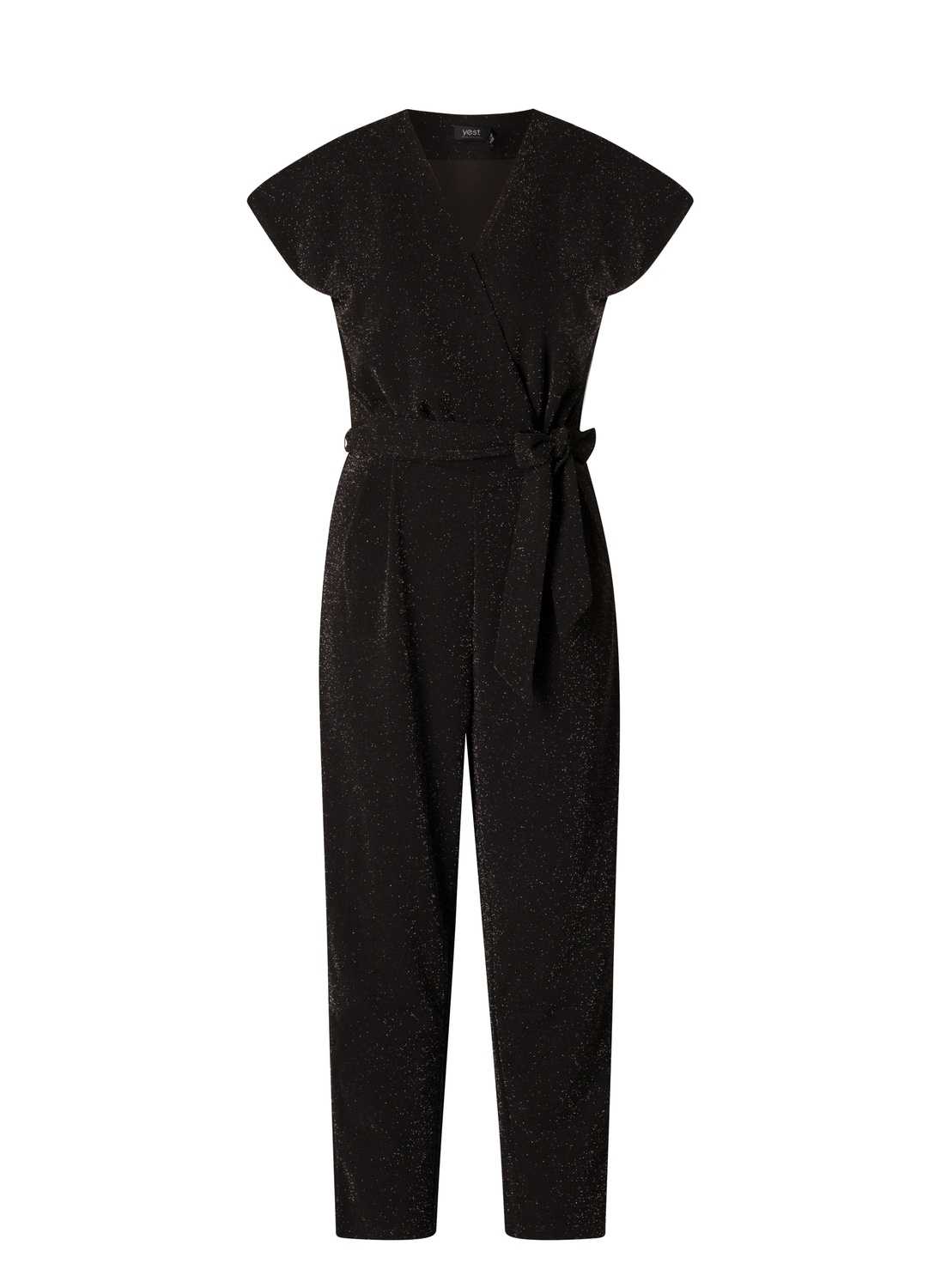 Stralend en feestelijk: de Yesta Theodora jumpsuit heeft een lengte van 29,5 inch en valt daardoor prachtig over de benen voor een elegant silhouet. Deze zwarte jumpsuit met kapmouwen is bezaaid met glinsterende zilverkleurige lurex die het licht op een prachtige manier vangt.