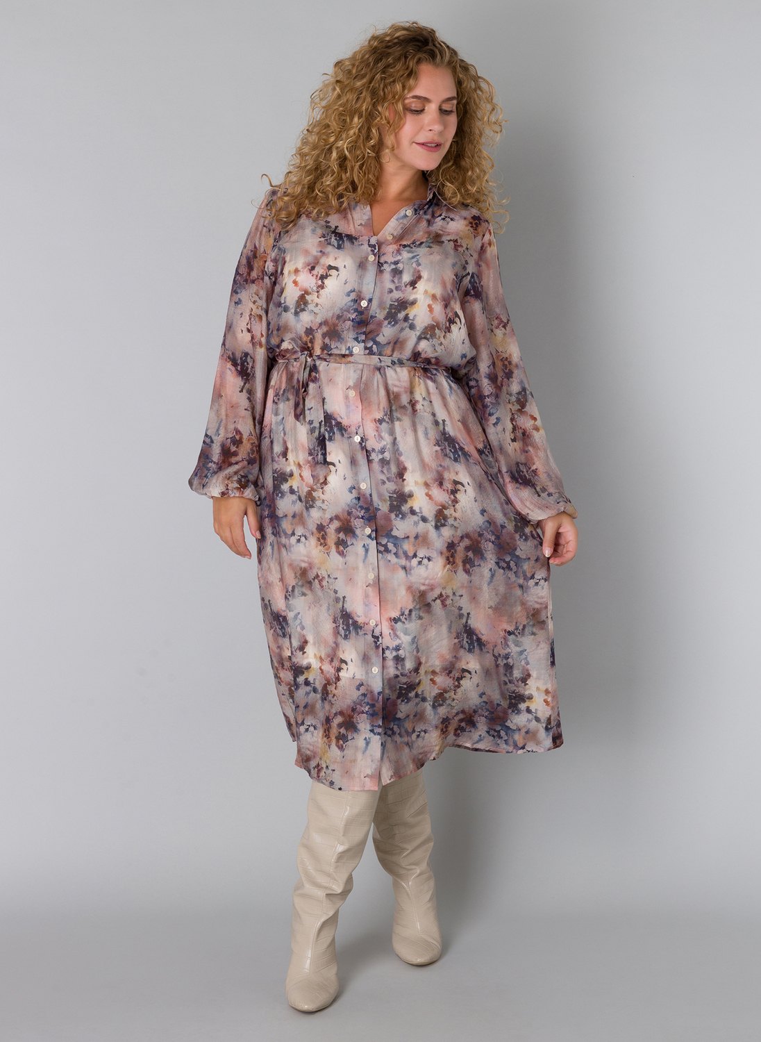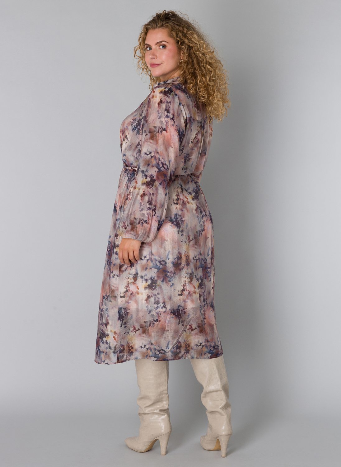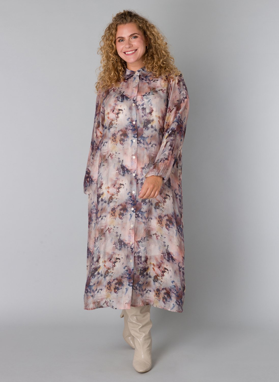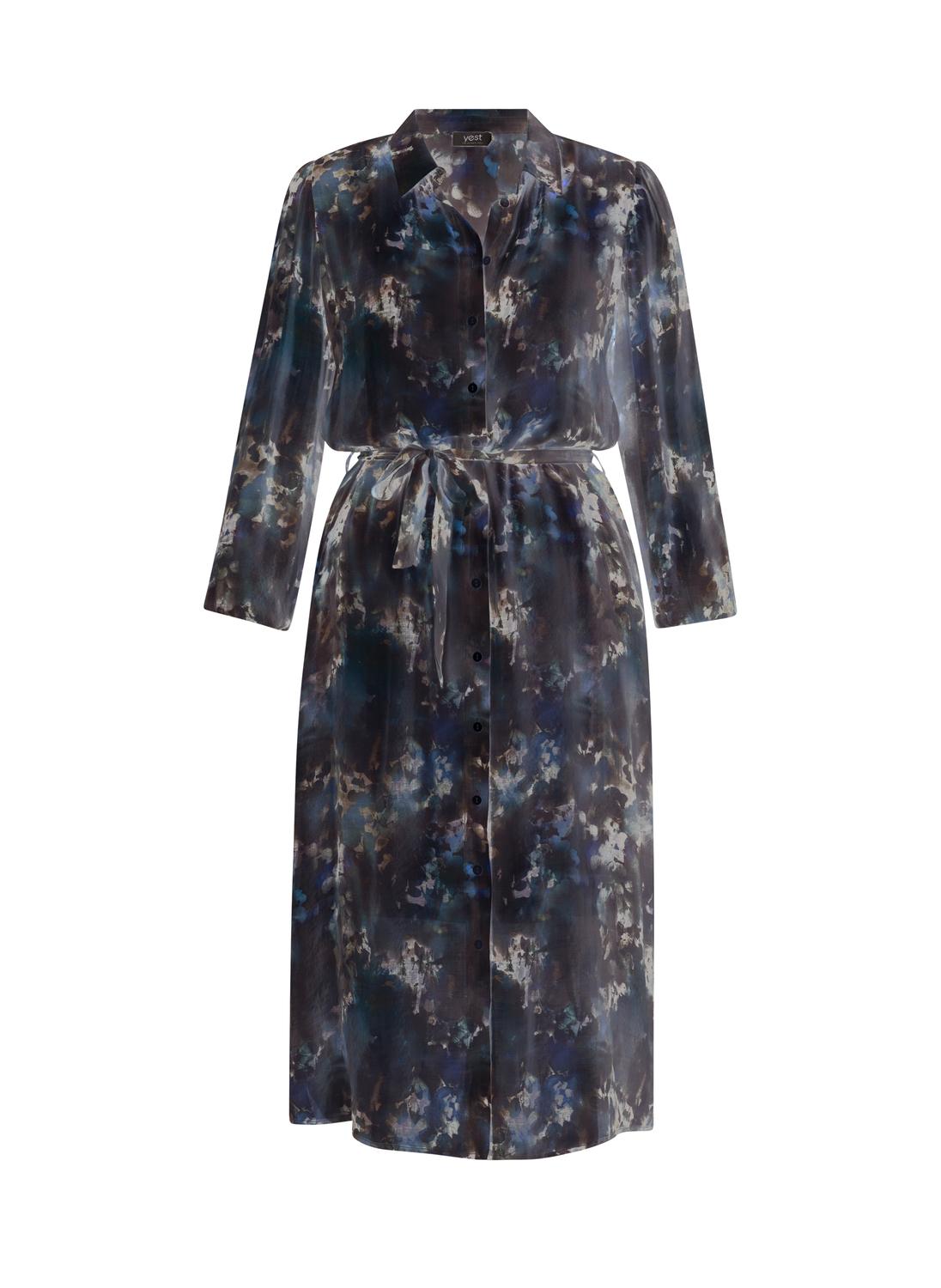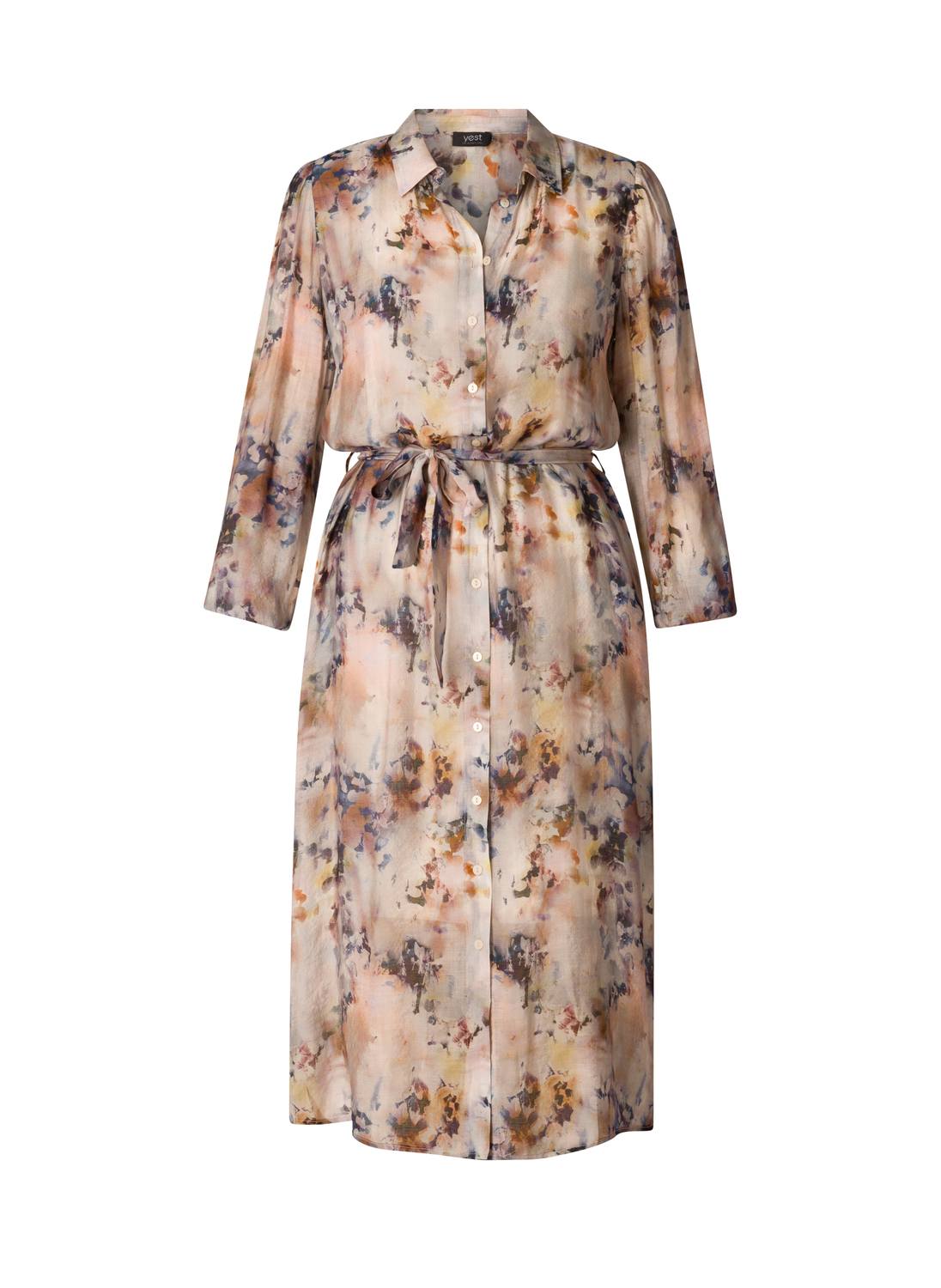 De Yesta Dilem Essential jurk heeft een lengte van 125 cm en valt daardoor prachtig tot over de kuit voor een elegant silhouet. Deze semi-transparante jurk combineert een allover print in zachte tinten met een doorknoopmodel, wat zorgt voor een speelse én verfijnde uitstraling.