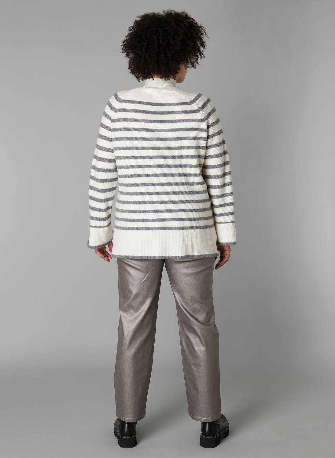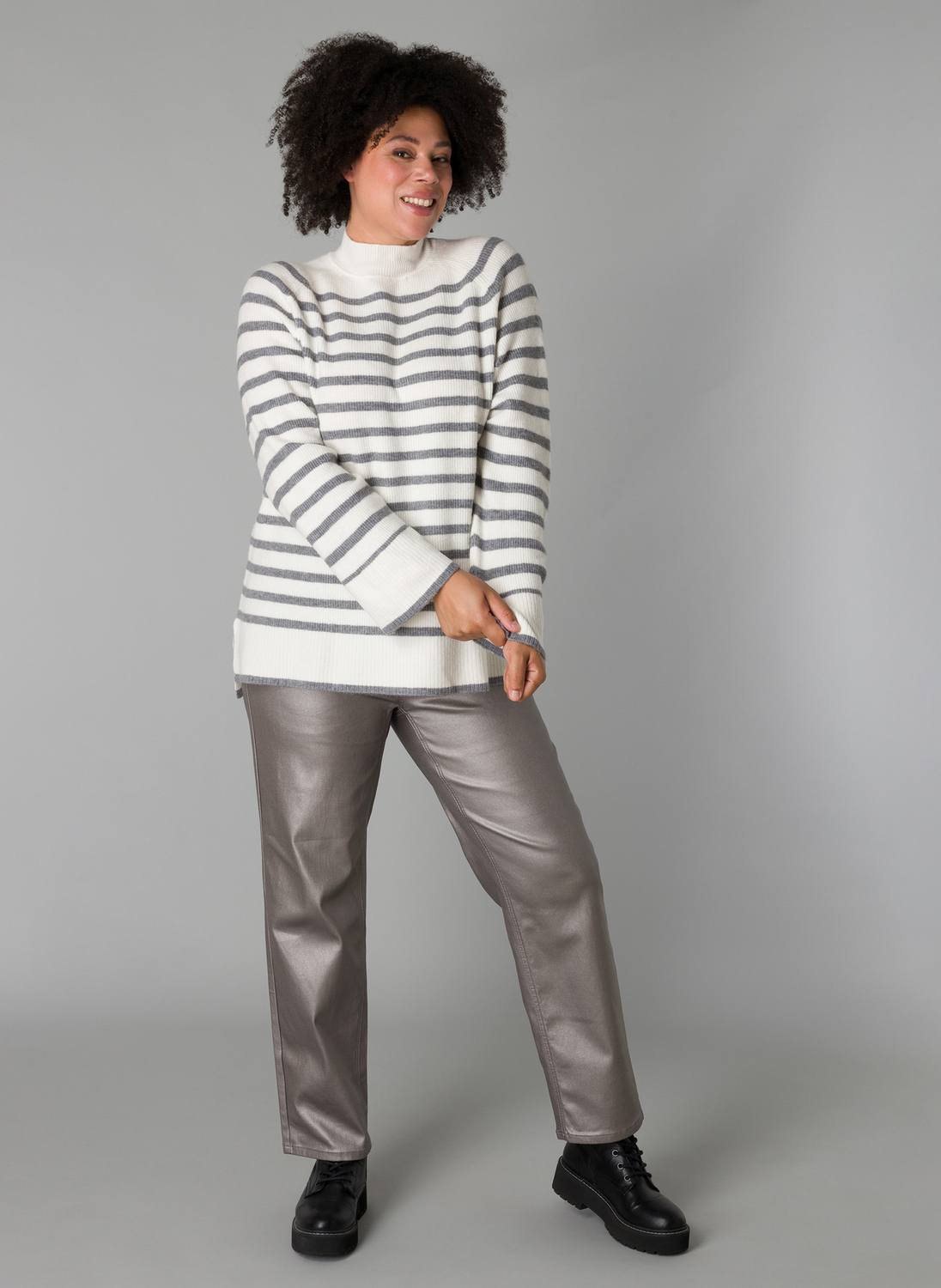 Deze zachtgebreide Yesta trui met horizontale strepen is ontworpen in een recht model met splitjes in de zijnaad. Deze heerlijke trui heeft een opstaande neklijn en lange rechte mouwen voor een klassieke uitstraling. De Selma is 75 cm lang.