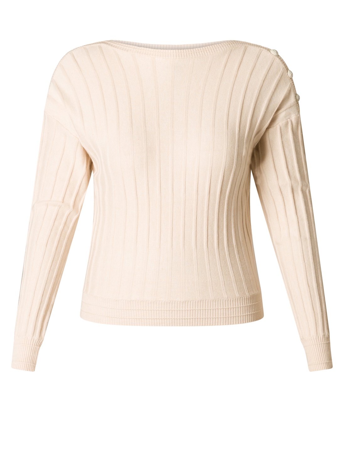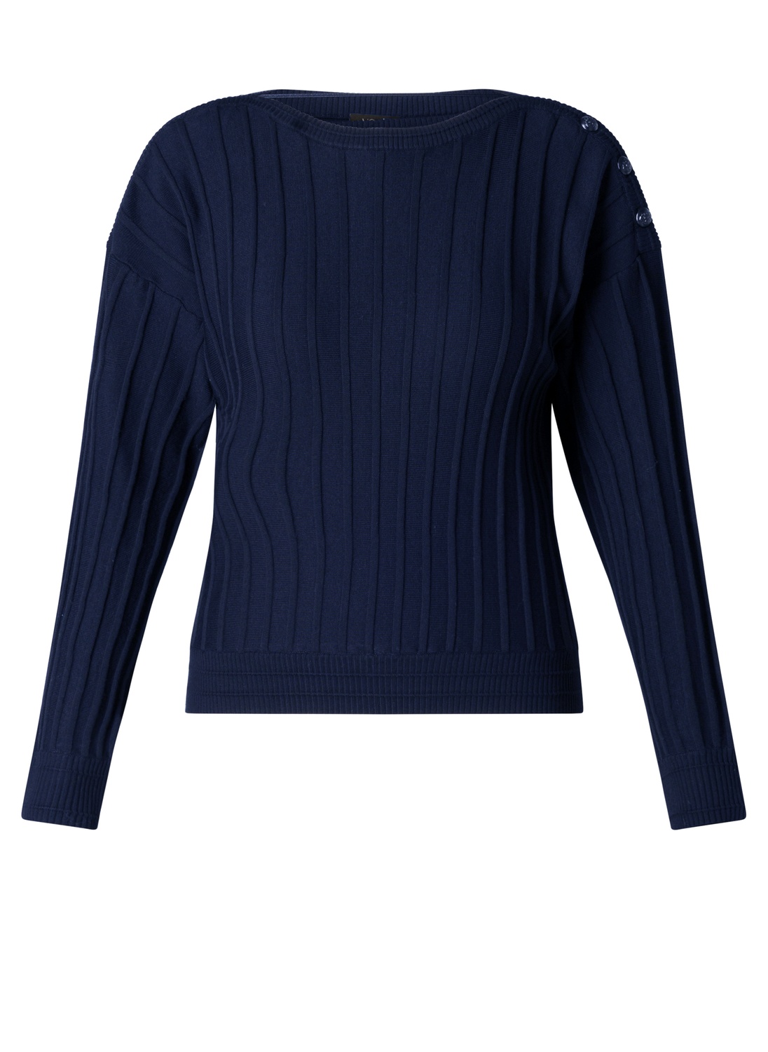 De boothals met knopen op de schouders geeft een speelse, vrouwelijke touch, terwijl de trui perfect te combineren is met de bijpassende rok voor een elegante look. Verkrijgbaar in de kleuren Black, Marine Blue en Sandy White melange, een veelzijdige toevoeging aan je garderobe.