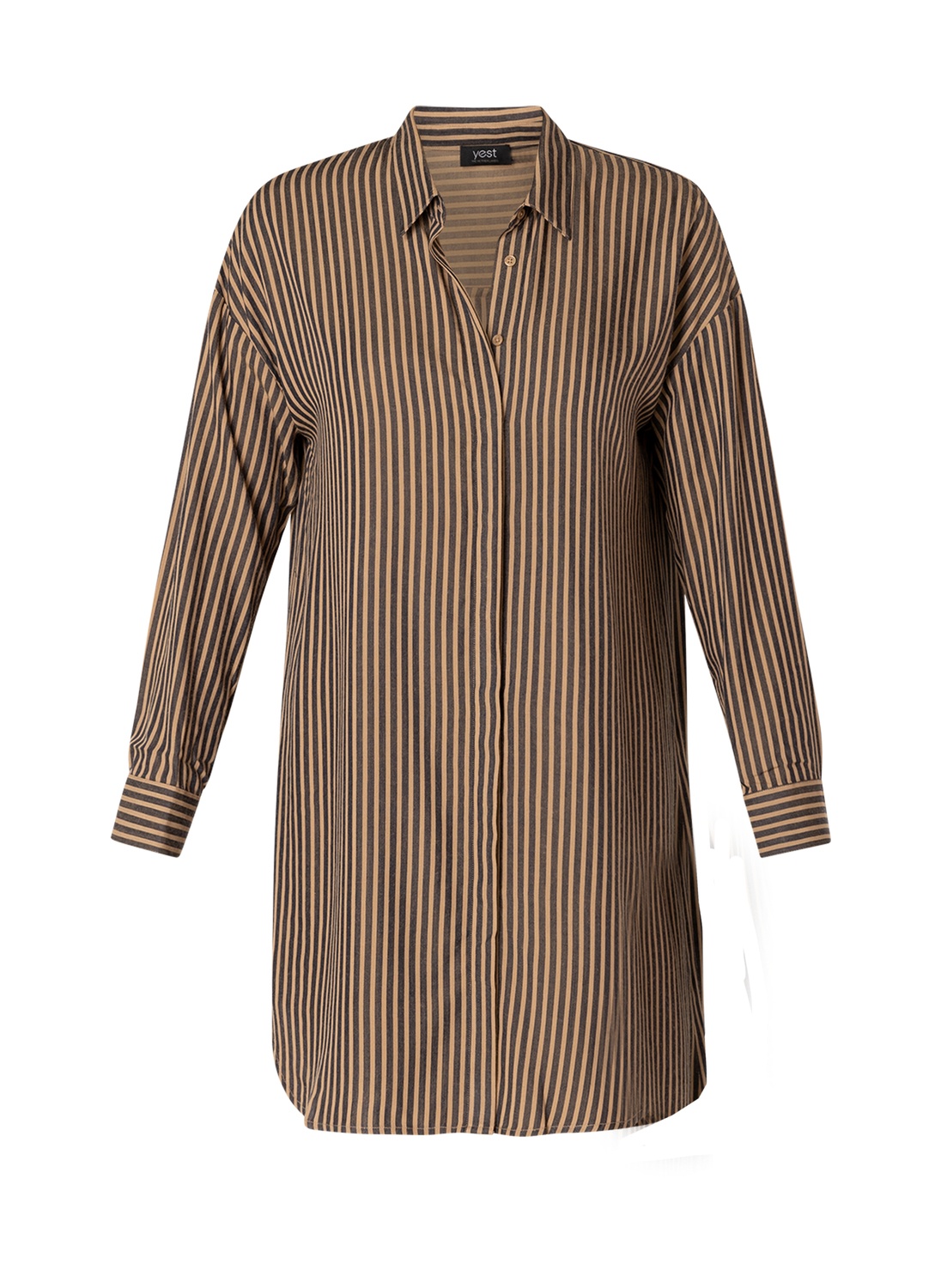 Gestreepte lange blouse in een glad geweven stof met lange mouwen en een blinde knoopsluiting. Het achterpand is langer en loopt rond weg aan de onderkant. Leuk met een slimfit broekje, of met een ceintuur en een paar hoge laarzen eronder. De Barbel van YESTA heeft een Comfort Fit en is gemaakt van 100% Viscose. Deze tuniek is verkrijgbaar in Kit/Dark Navy. De mooiste tunieken vind je in de categorie grote maten tunieken.