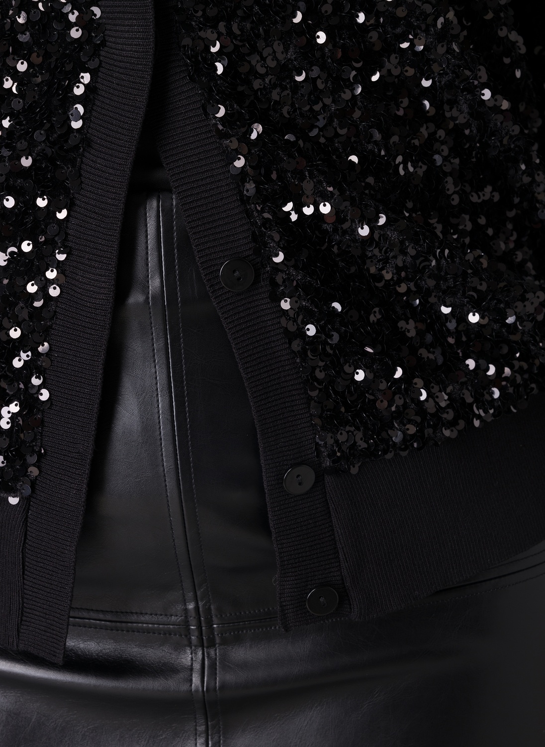 Voeg een sprankelend accent toe aan je feestoutfits met dit zwarte gebreide vest, dat elegantie en comfort perfect combineert. Het vest is versierd met knopen en glinsterende pailletten op de voorzijde en de mouwen, waardoor het een opvallend en feestelijk statement maakt.