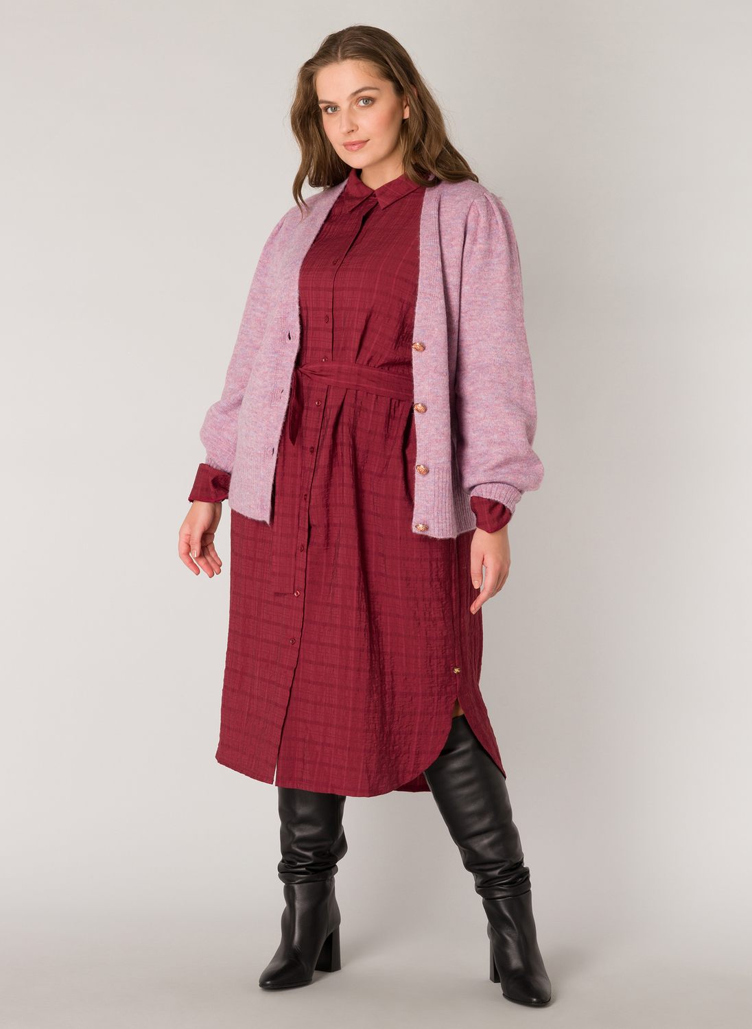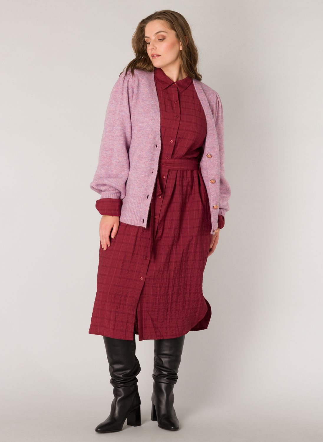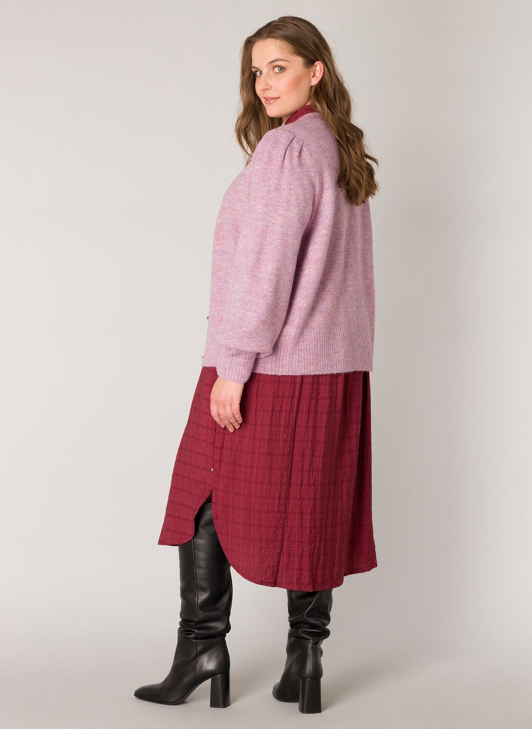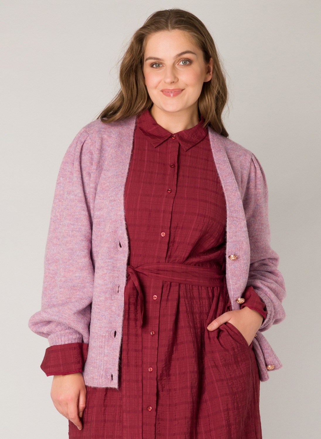 De Verla Essential van Yesta is een gebreid vestje in een gemeleerde violet kleur. Dit vestje heeft een regular fit, lange mouwen met plooien op de schouders en ribgebreide manchetten. De lage halslijn wordt afgewerkt met glanzende koperkleurige knopen.