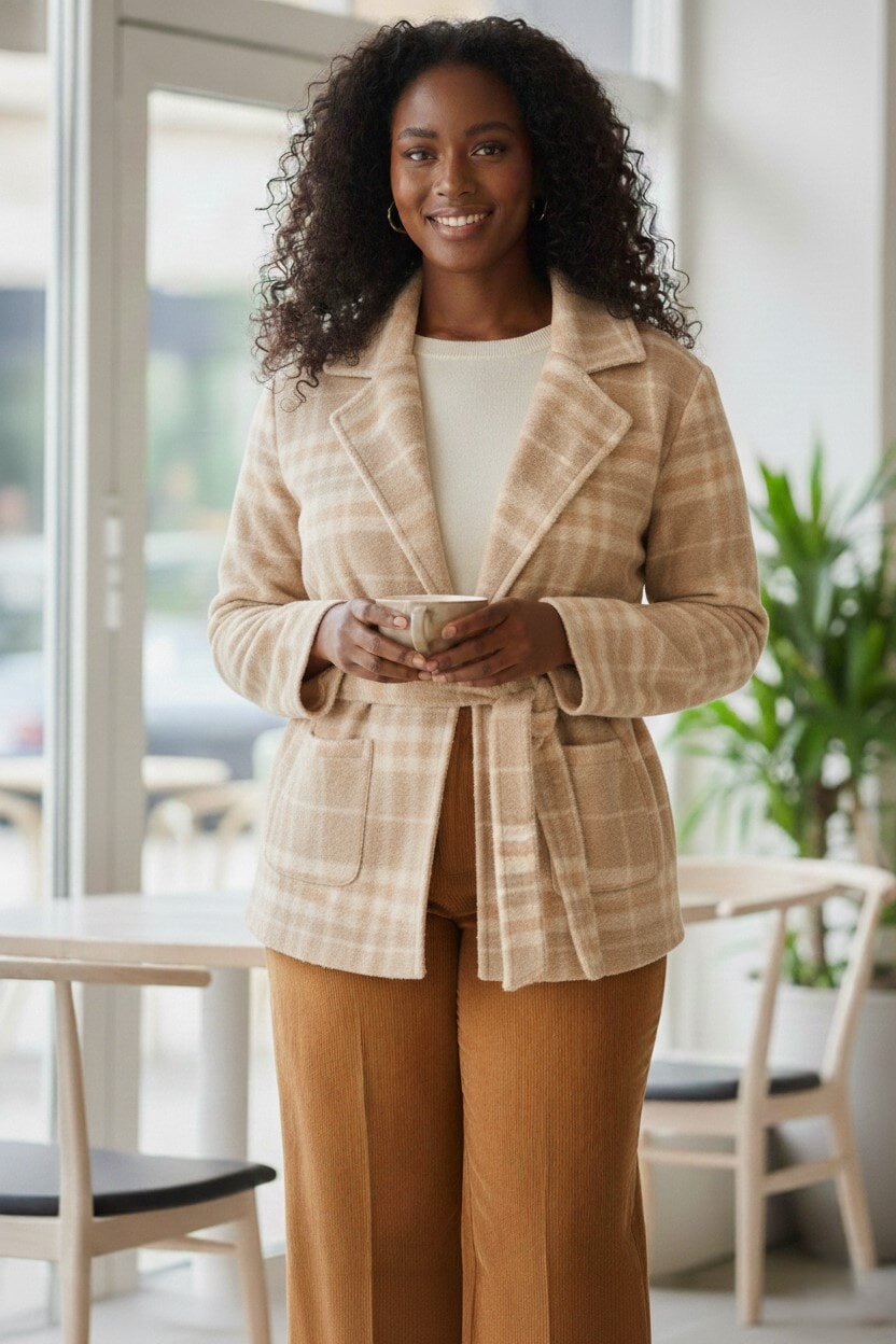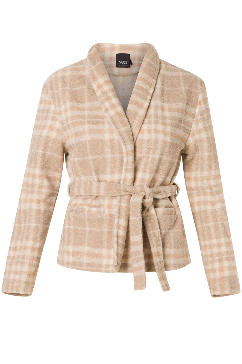 Dit jasje van Yesta is gemaakt van zachte geruite dekenstof en beschikt over een sjaalkraag en een bijpassende ceintuur voor een elegante uitstraling. Aan de voorkant zijn twee handige zakken toegevoegd voor extra functionaliteit.