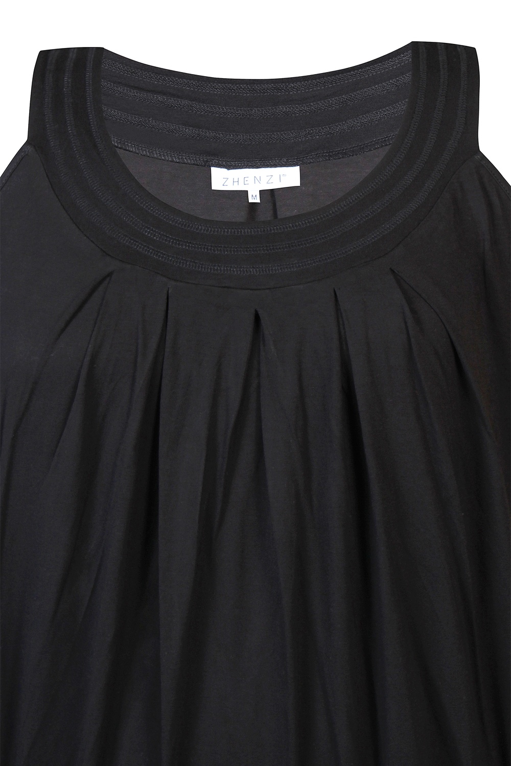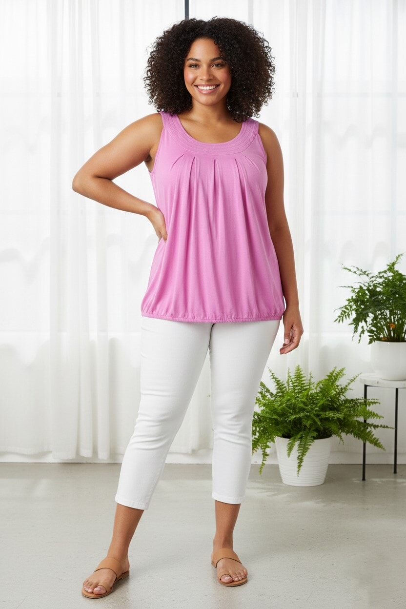 ZHENZI singlet elastiek zoom is een bekend model binnen de collectie. Het is dan ook een super fijn model. De ronde hals heeft een doorgestikt effect, en het singlet heeft elastiek in de zoom. Het model draagt hierbij de print broek 200206. Wat een fijne zomerse set!