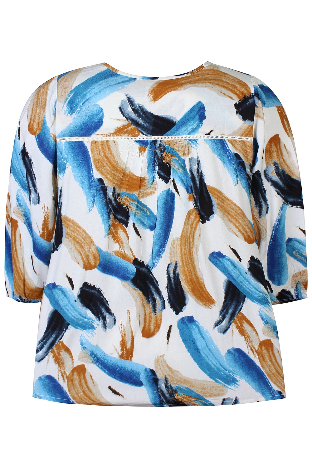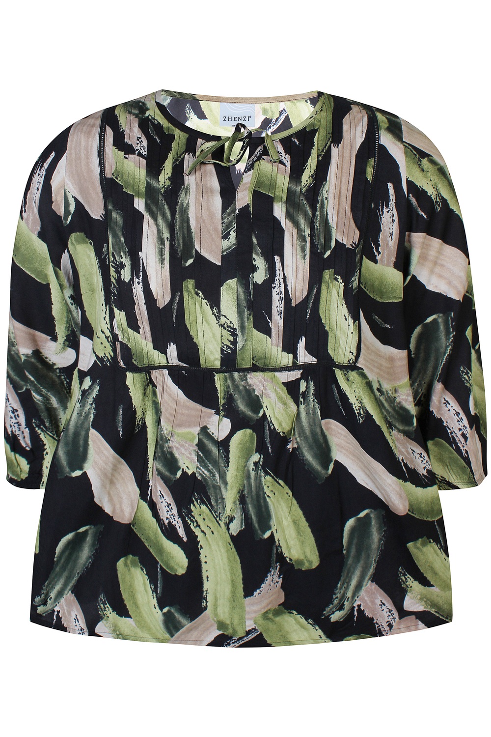 ZHENZI tuniek Lillie is een super leuk model met een Alijn pasvorm. De ronde hals heeft een V split en strikkoord. De pas onder de hals heeft doorgestikte platte plooien en rondom een opengewerkte rand. Deze rand zit ook bij de rugpas. De mouwen vallen driekwart en hebben een elastiekje in de zoom. Leuk om te combineren met een jeans, maar ook met de halfwijde broek uit de Zhenzi collectie 200379.